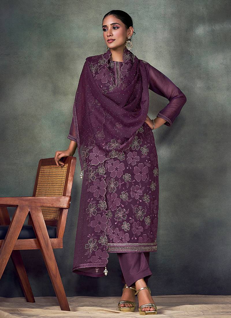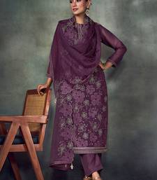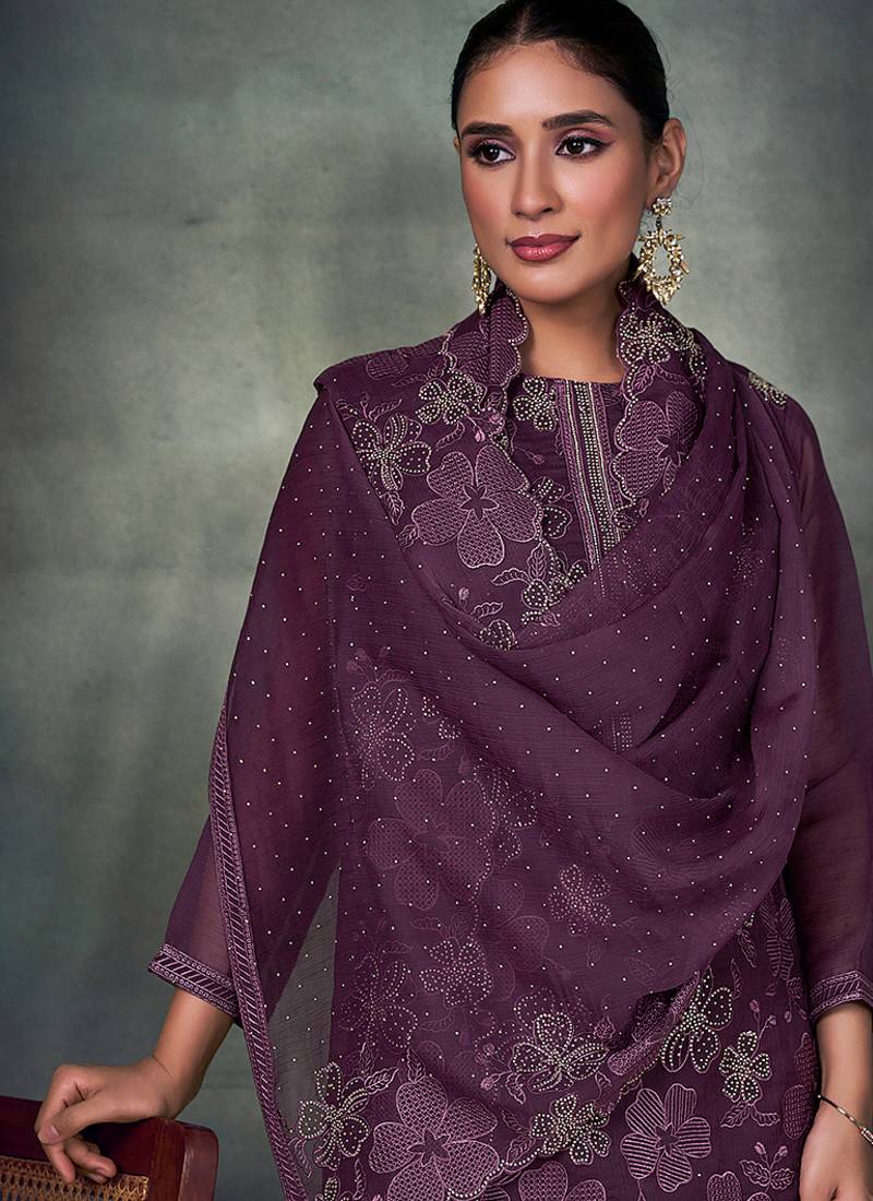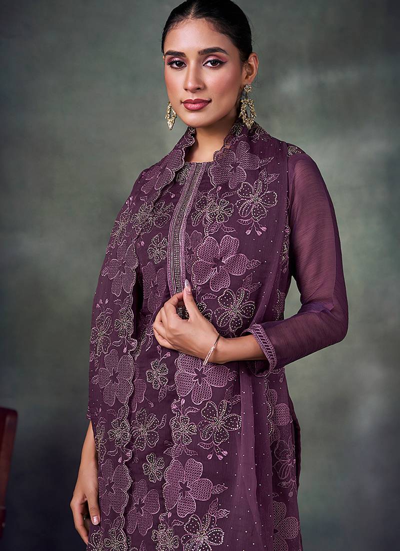 Purple embroidered & swarovski chiffon straight cut salwar kameez semi stitched