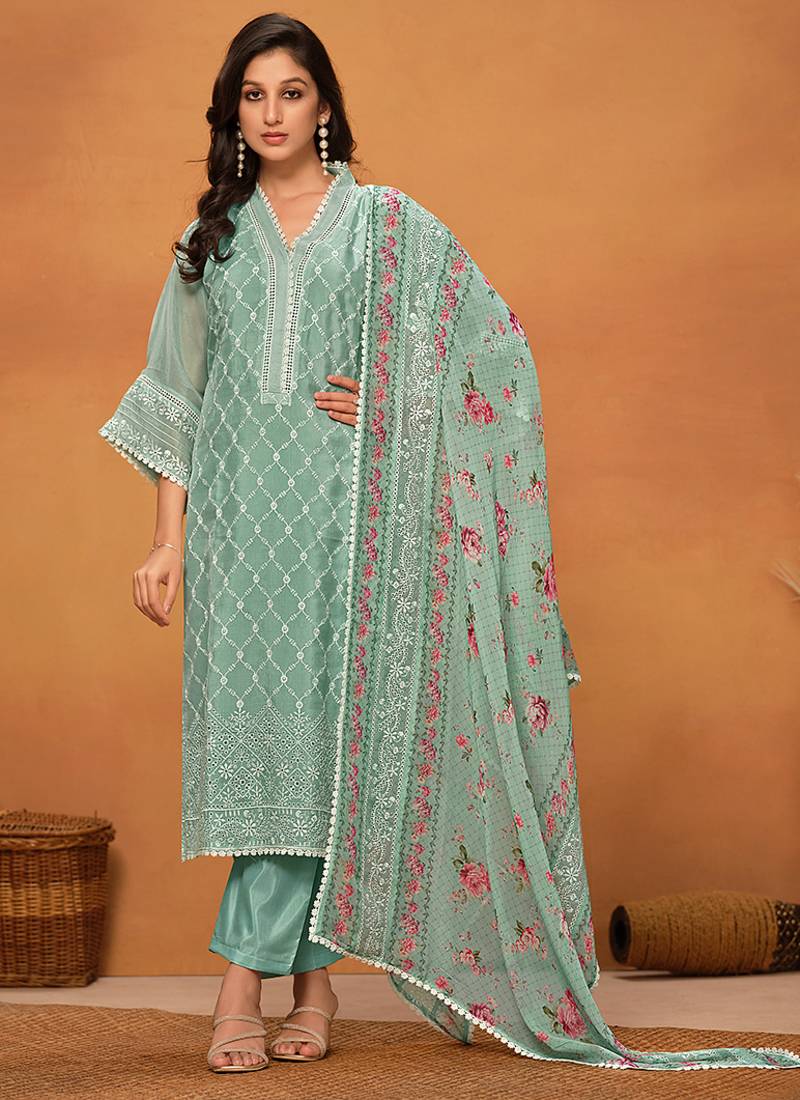 Sea green chikankari viscose organza straight cut salwar kameez for women semi stitched