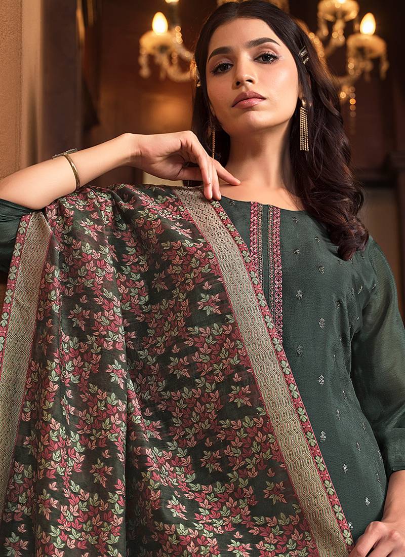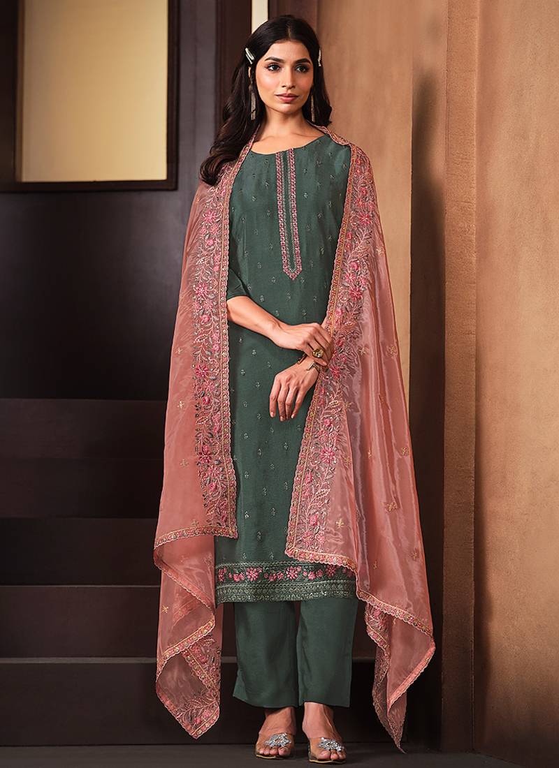 Product Name Sea Green Embroidered Chinnon Silk Straight Cut Salwar Kameez Dubble Dupatta