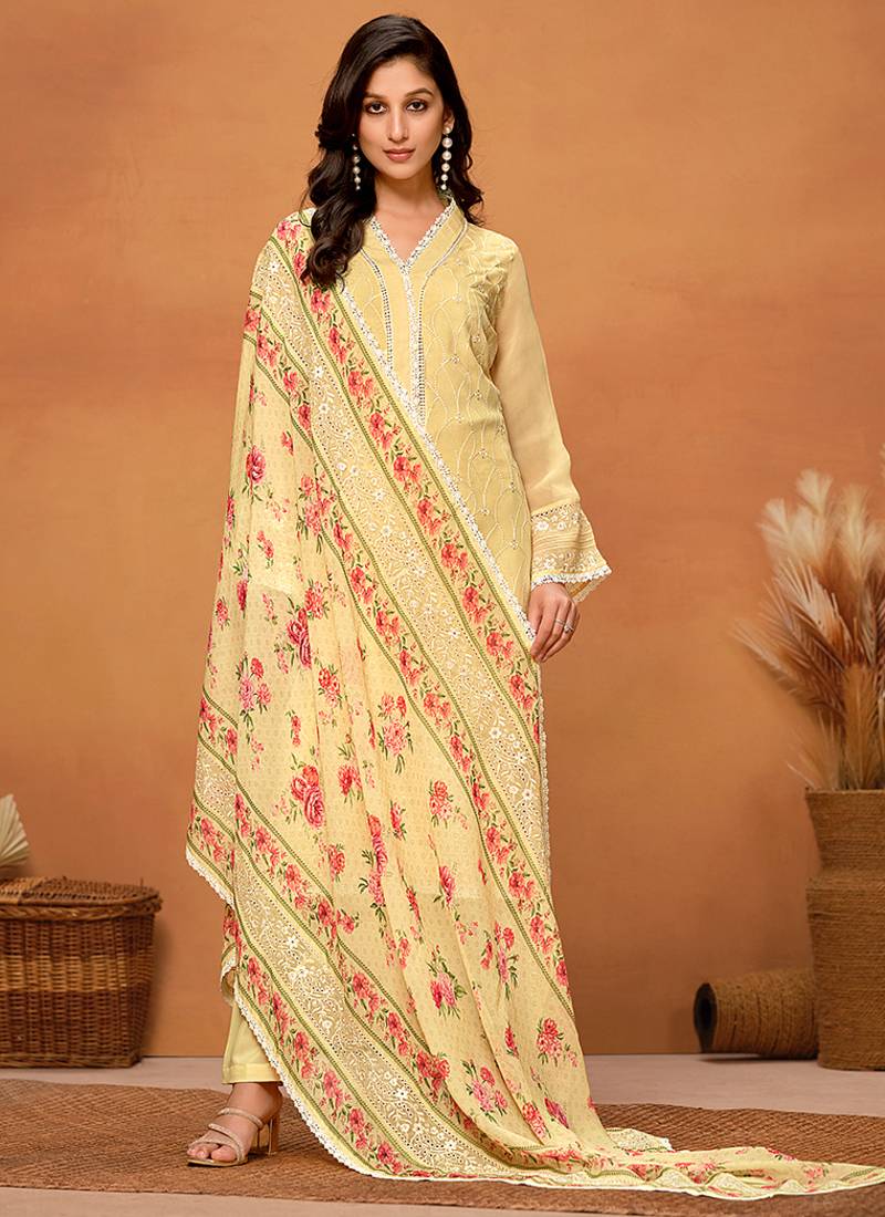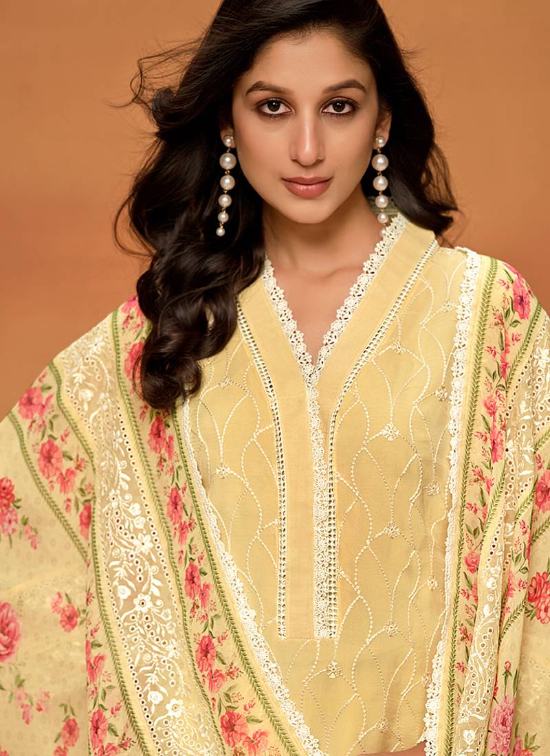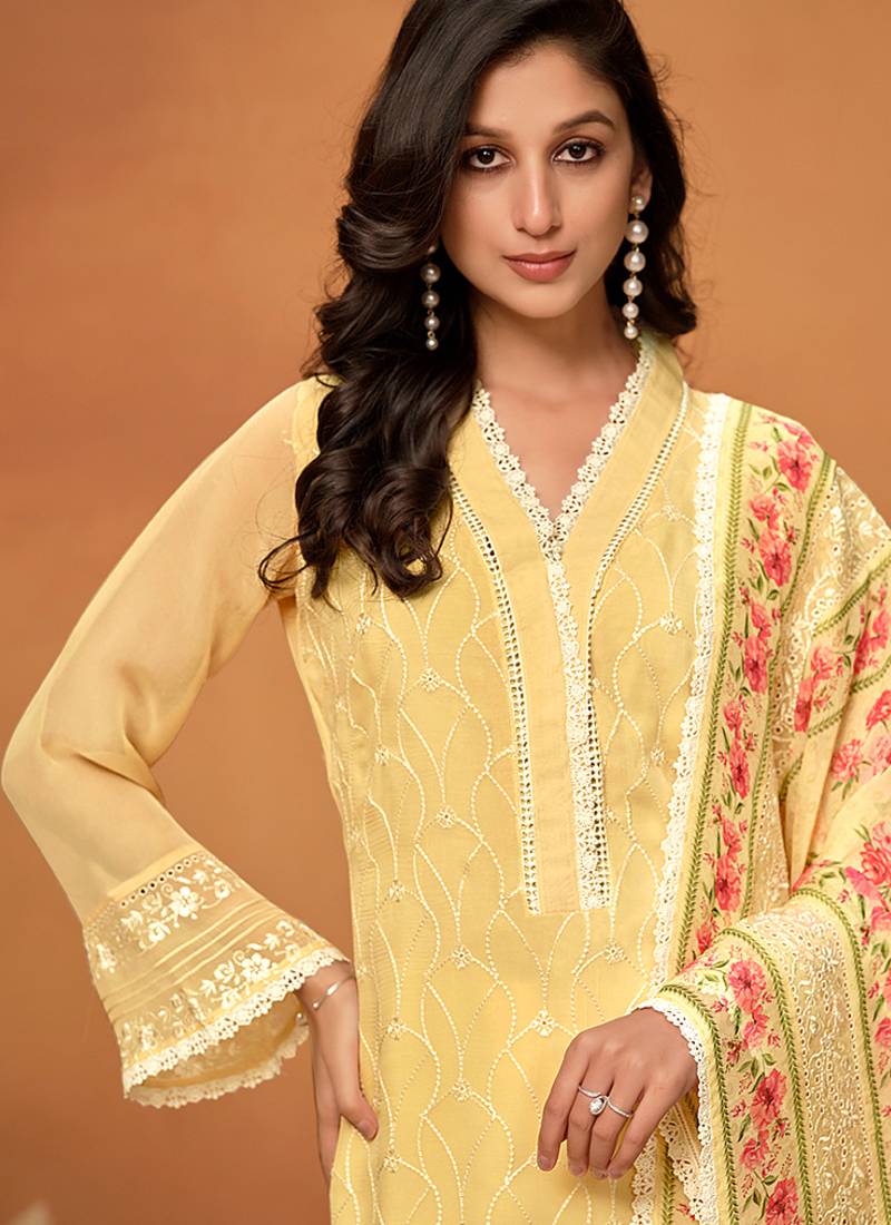 | Product Name | Yellow Chikankari Viscose Organza Straight Cut Eid Wear Salwar Kameez | |