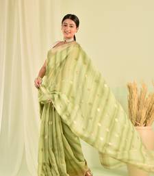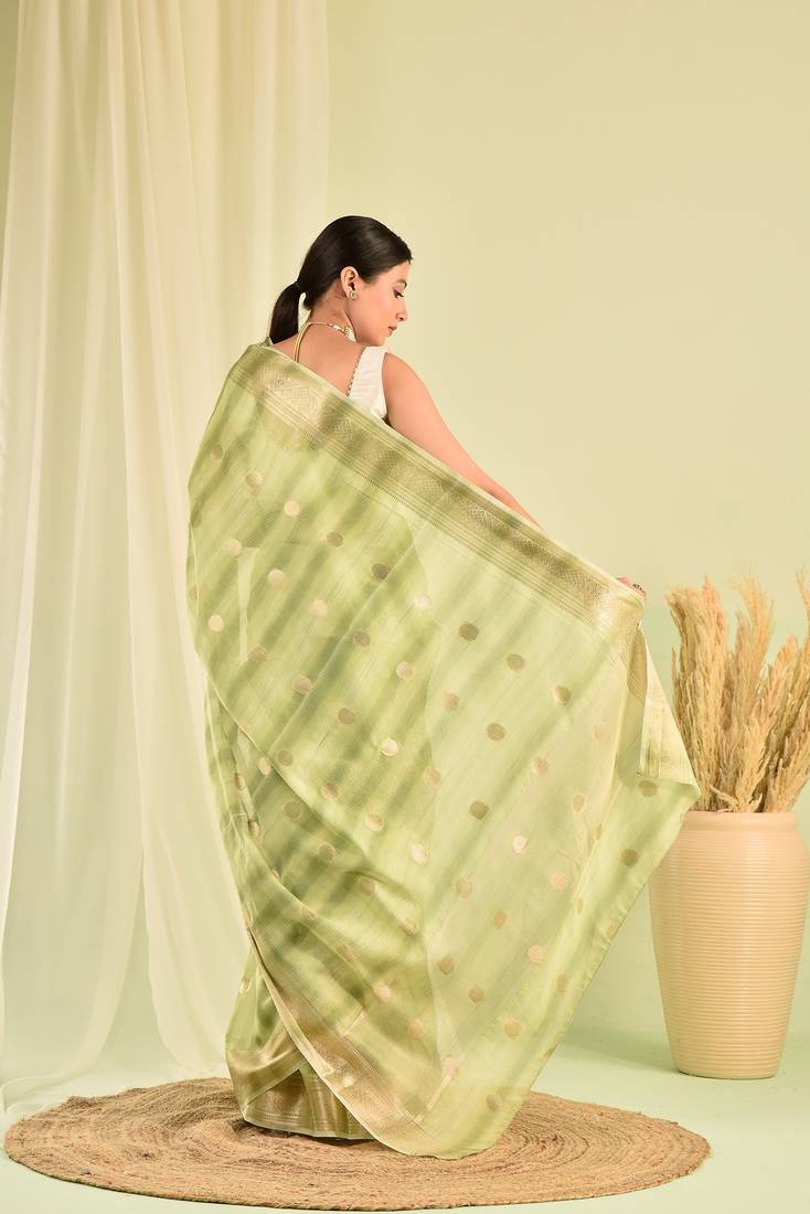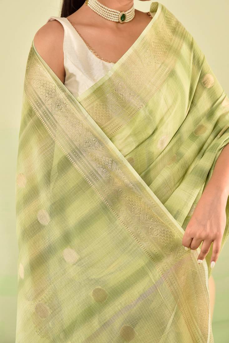 This Green Kota Doria Saree Is Beautifully Embellished With Intricate Zari Banarasi Booties, Adding A Touch Of Elegance To Any Occasion. It Comes With A Matching Blouse Piece, Completing A Timeless And Sophisticated Look.