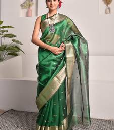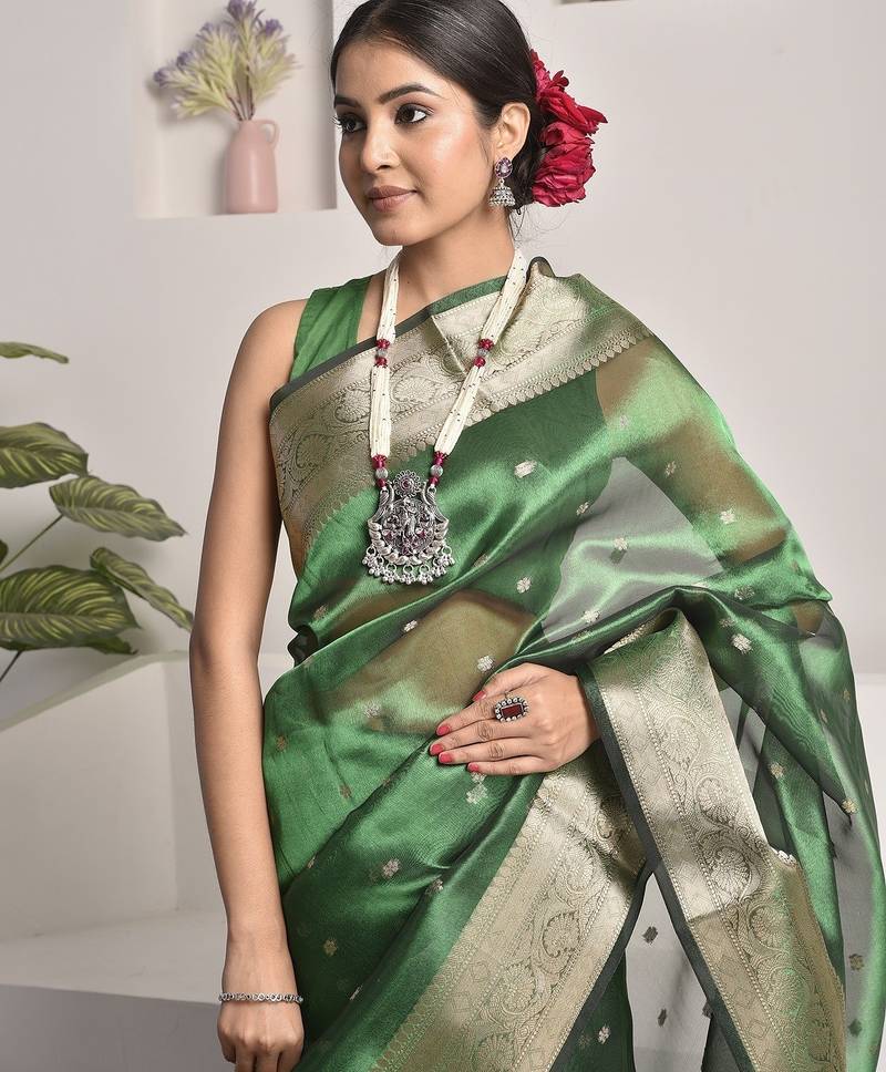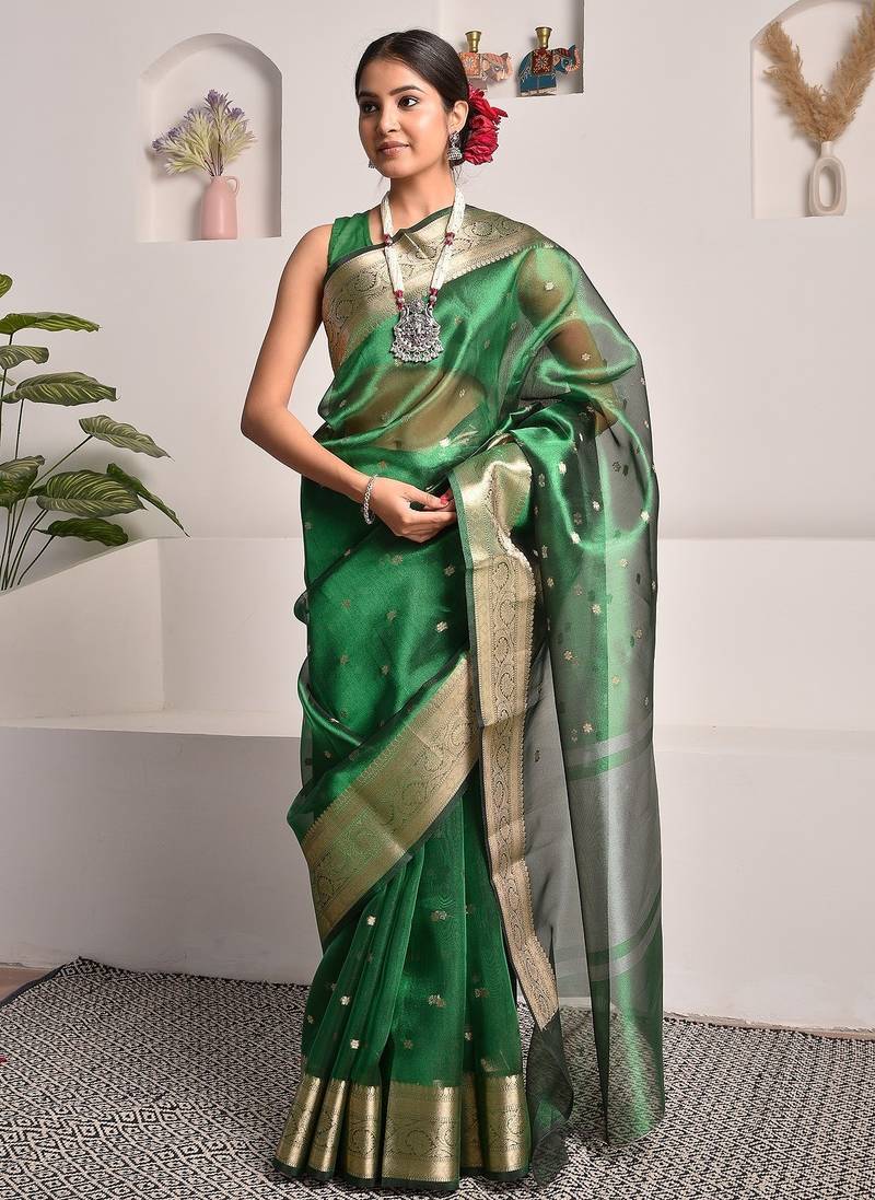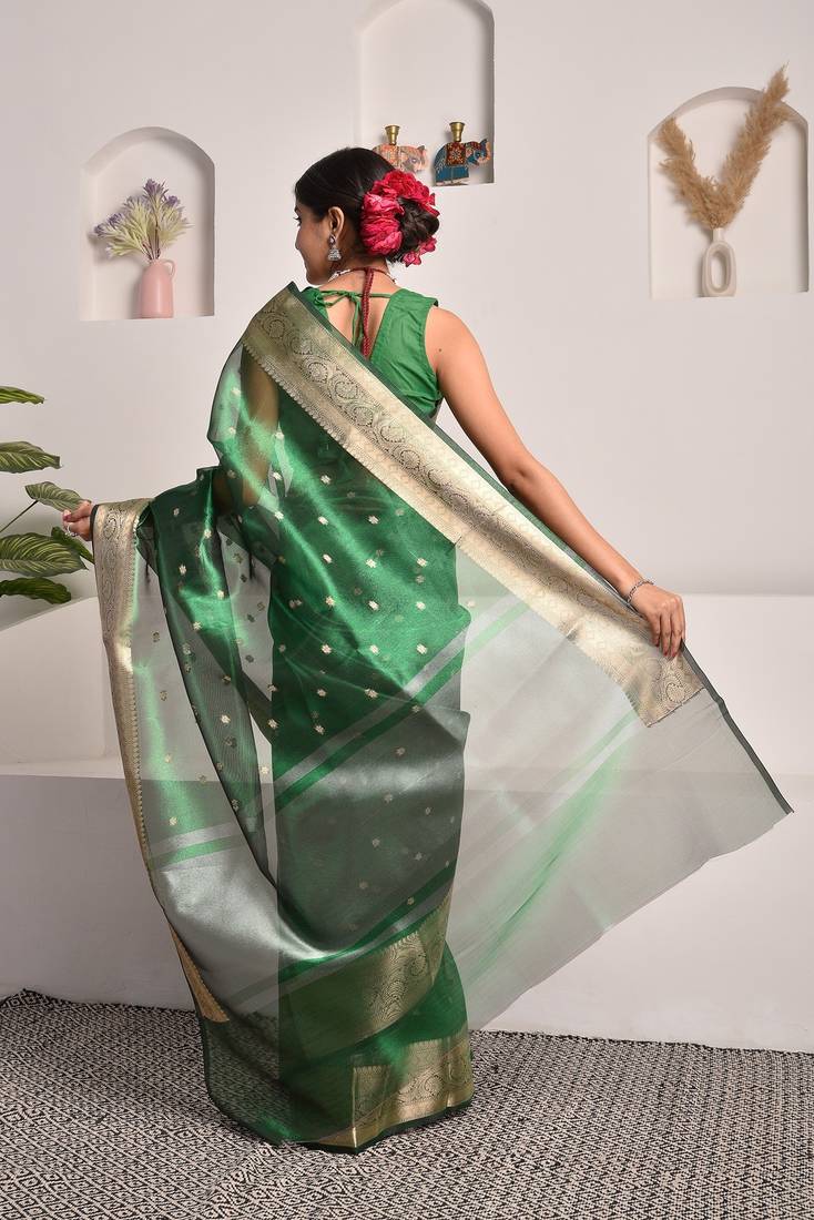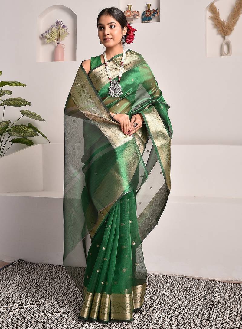 | Product Description | Features: Crafted In Luxurious Banarasi Tissue, This Green Saree Features Delicate Zari Booties That Add Timeless Elegance Color: Green