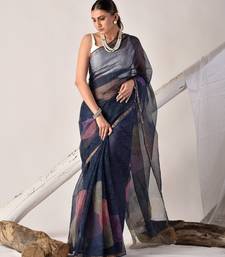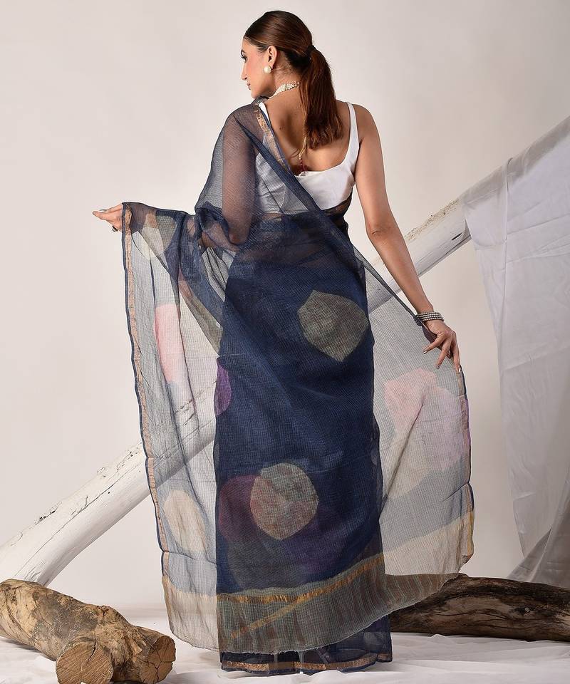 Indigo blue block printed pure kota doria saree