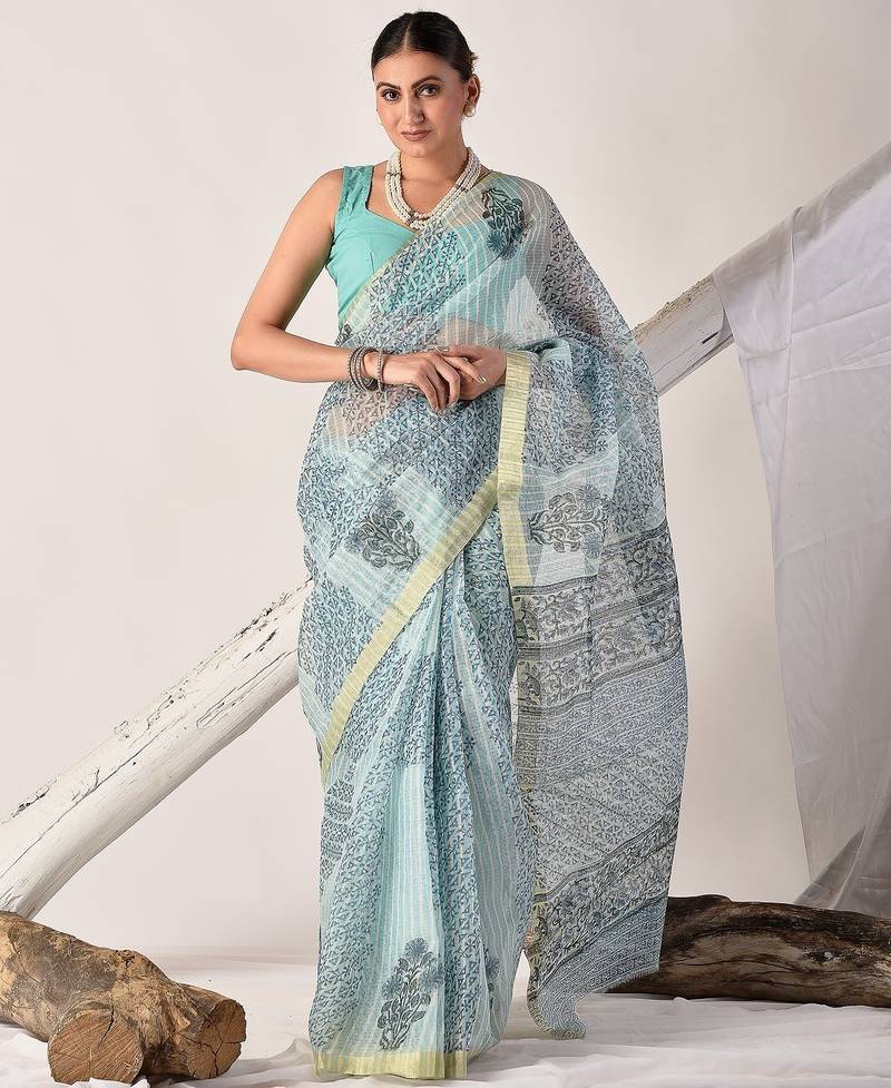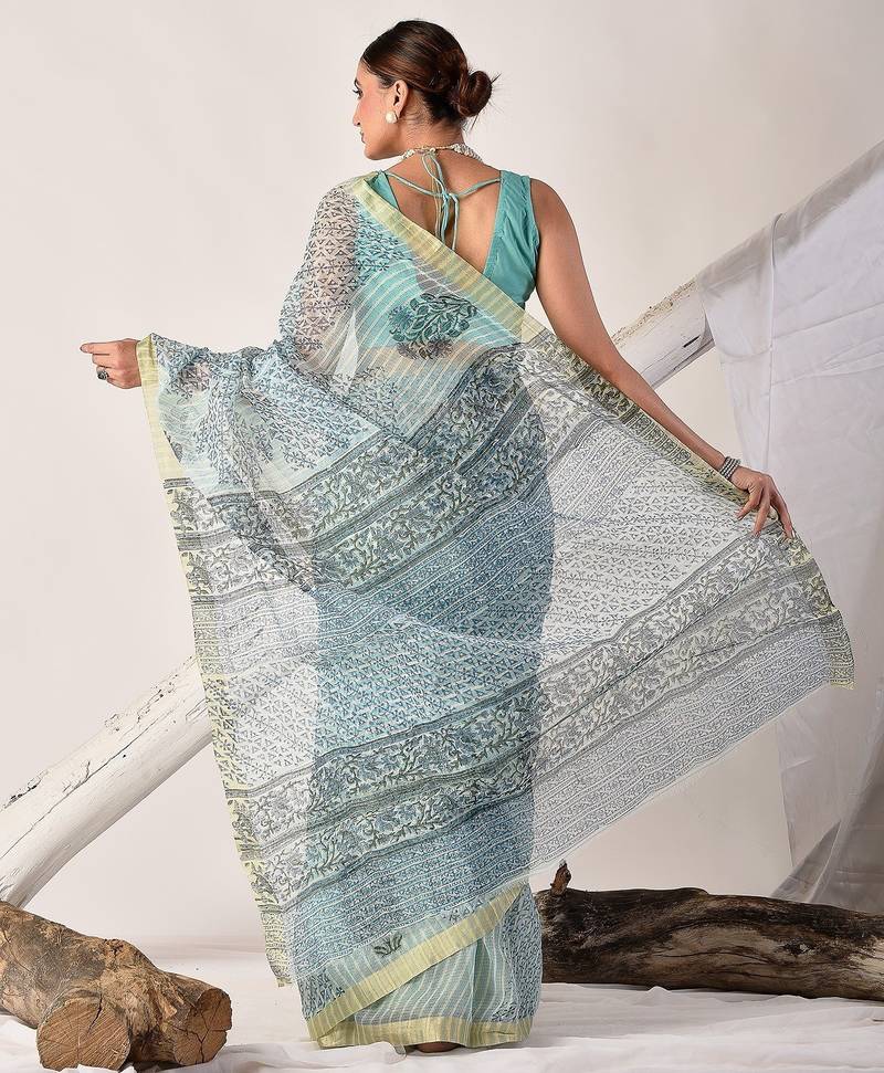 | Product Name | Turquoise Blue Block Printed Pure Kota Doria Floral Saree | |