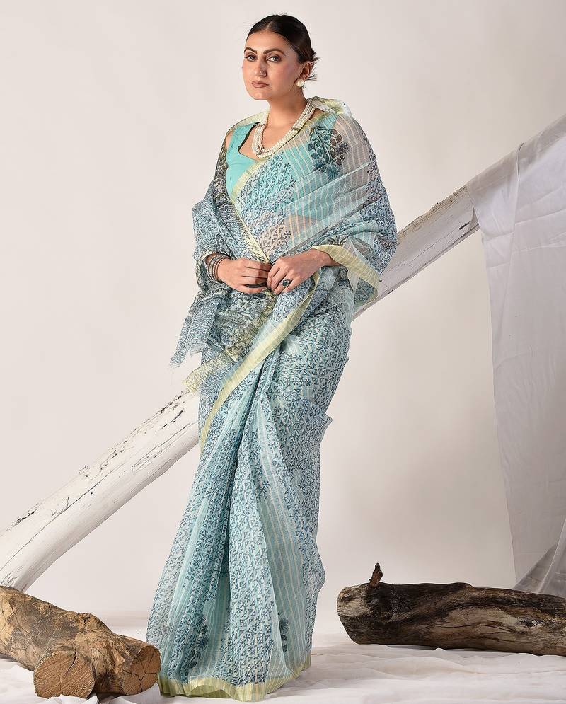 Turquoise blue block printed pure kota doria floral saree