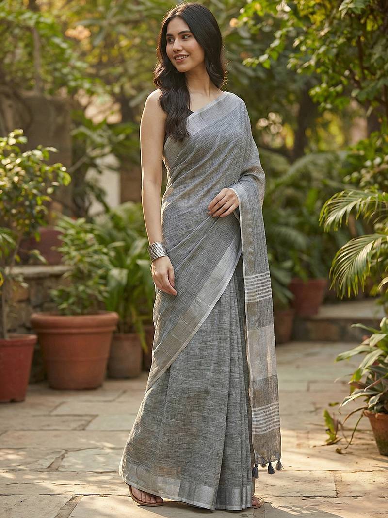| Product Name | Elegant Dark Grey Woven Linen Saree With Contrast Zari Border & Tassels Soft & Breathable Party Wear | |