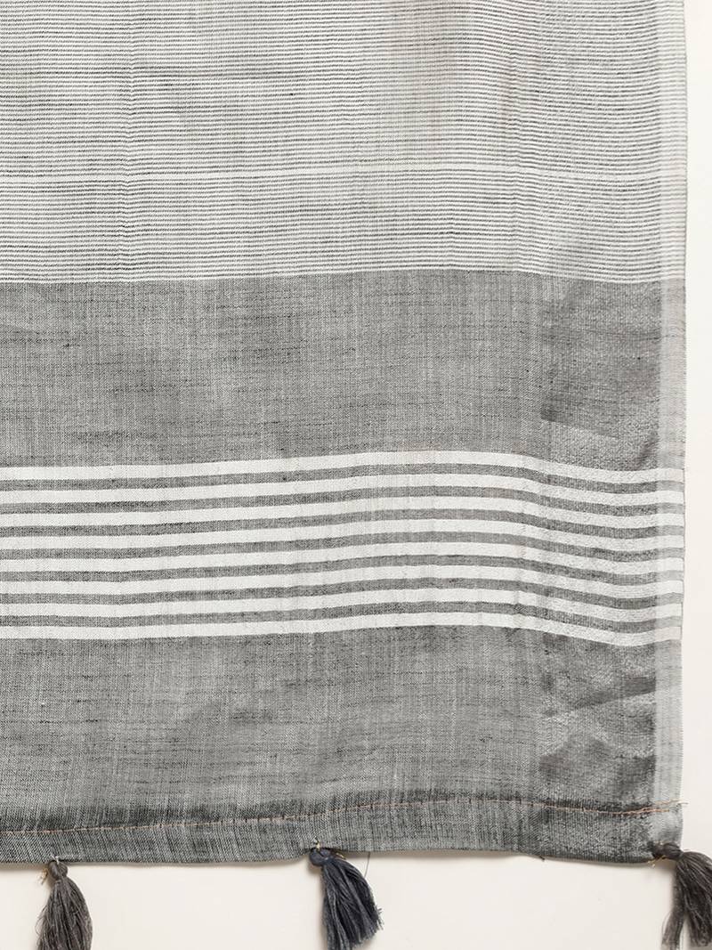 Elegant dark grey woven linen saree with contrast zari border & tassels soft & breathable party wear