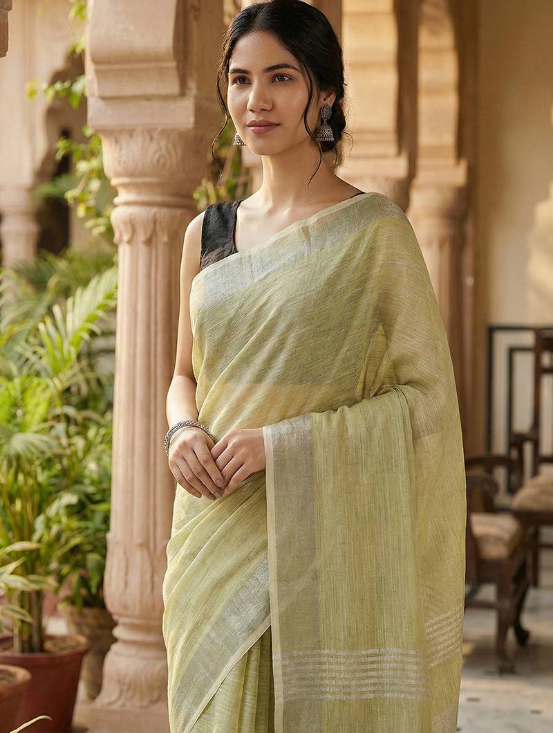 | Product Name | Elegant Mhendi Woven Linen Saree With Contrast Zari Border & Tassels Soft & Breathable Party Wear | |