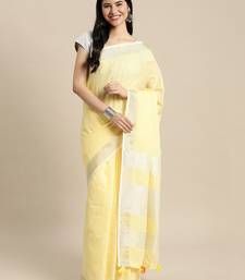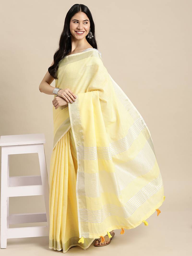 Elegant yellow woven linen saree with contrast zari border & tassels soft & breathable party wear