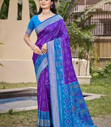 Exquisite violet & sky blue pochampalli soft silk blend saree with grand ikat woven pallu