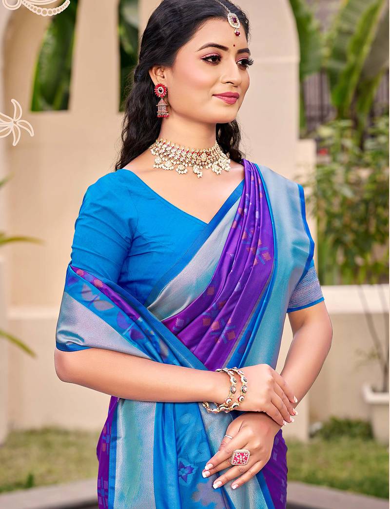 | Product Name | Exquisite Violet & Sky Blue Pochampalli Soft Silk Blend Saree With Grand Ikat Woven Pallu | |