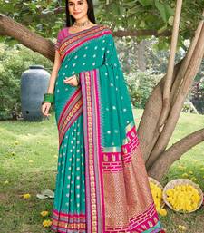 Graceful sea green banarasi silk blend saree with golden zari woven border & floral jaal wedding & festive wear