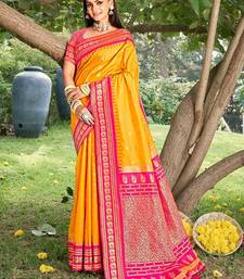 Graceful yellow banarasi silk blend saree with golden zari woven border & floral jaal wedding & festive wear