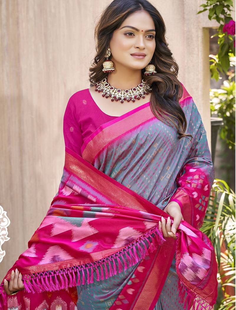 | Product Name | Grey & Magenta Pochampalli Soft Silk Blend Saree With Traditional Ikat Woven Pallu | |