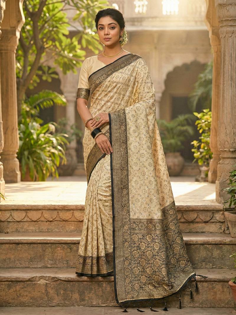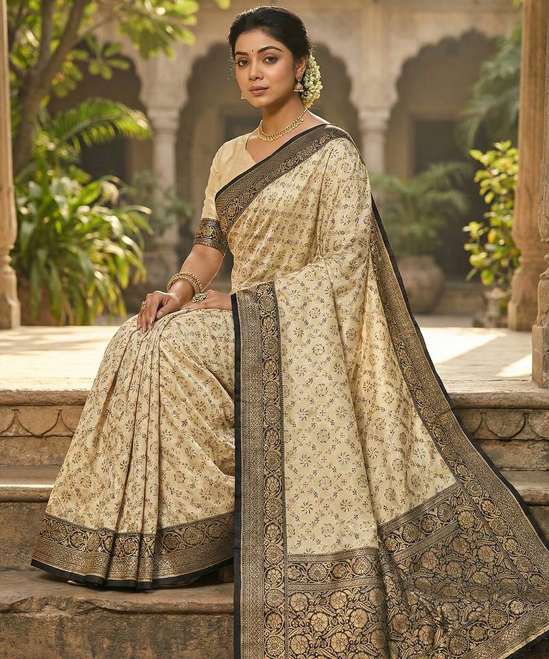 Ivory and black banarasi silk saree with golden zari – regal elegance for timeless celebrations