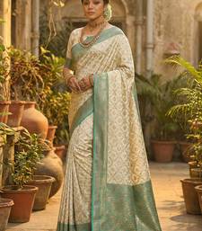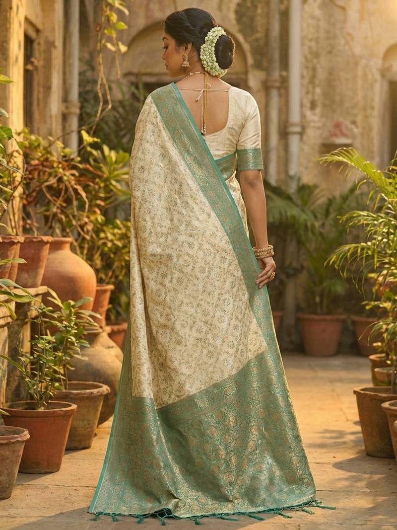 Ivory and sea green banarasi silk saree with golden zari – regal elegance for timeless celebrations