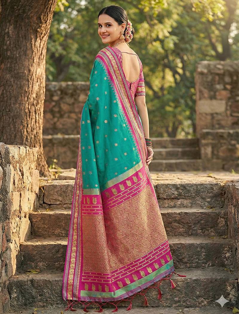 Sutriti graceful sea green banarasi silk saree with golden zari woven border & floral jaal – wedding & festive wear