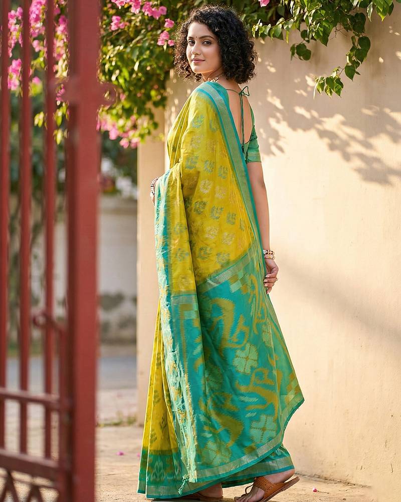 | Product Name | Sutriti Mustard Yellow & Green Pochampalli Soft Silk Saree With Traditional Ikat Pallu Sari | |