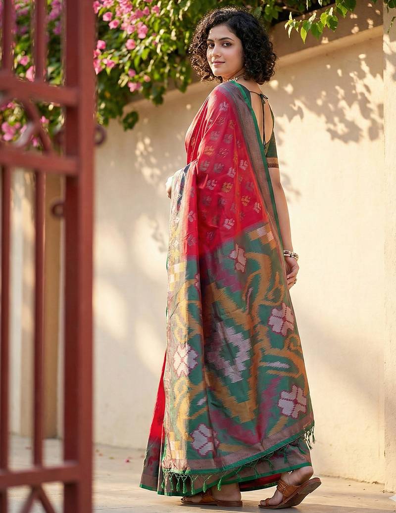 | Product Name | Sutriti Red & Mhendi Green Pochampalli Soft Silk Saree With Traditional Ikat Pallu Sari | |