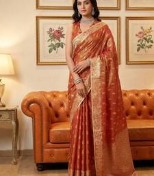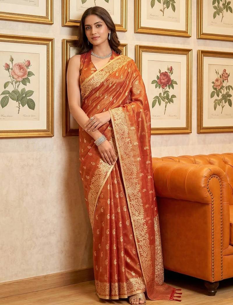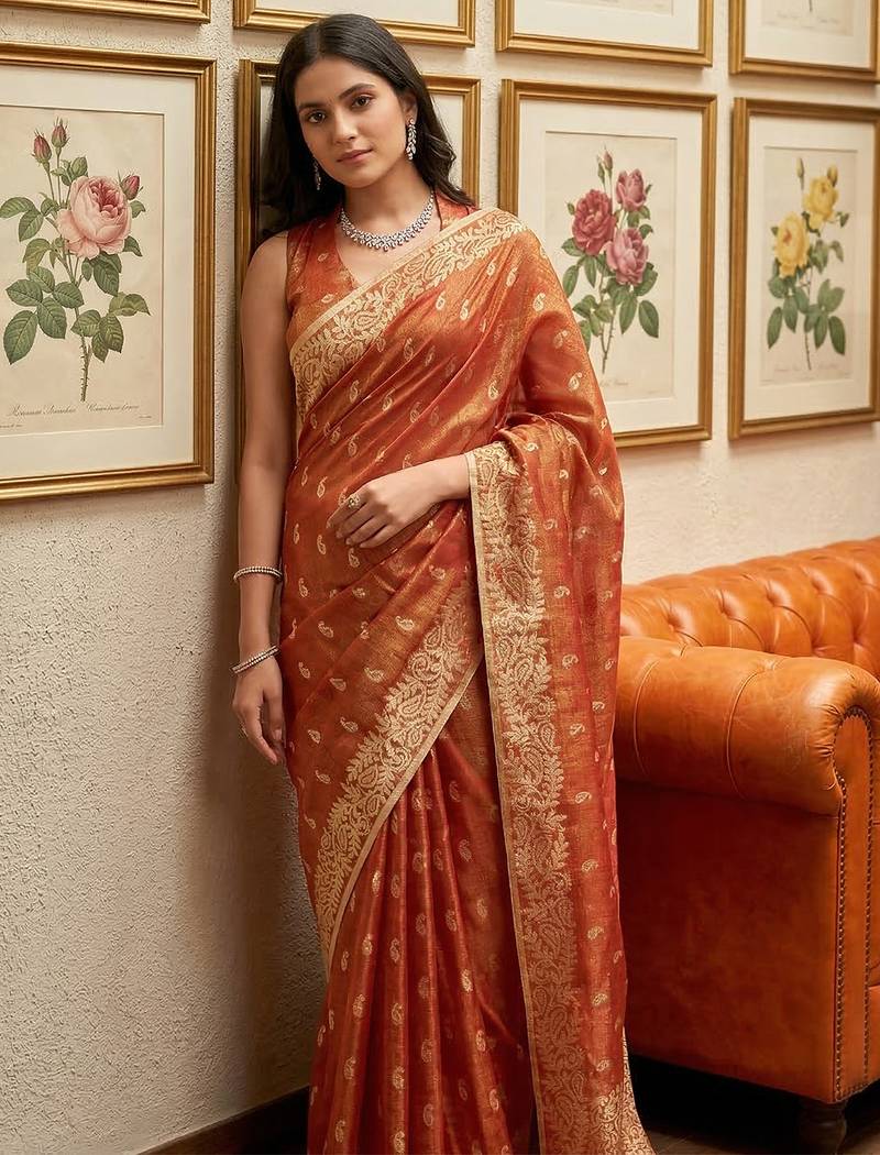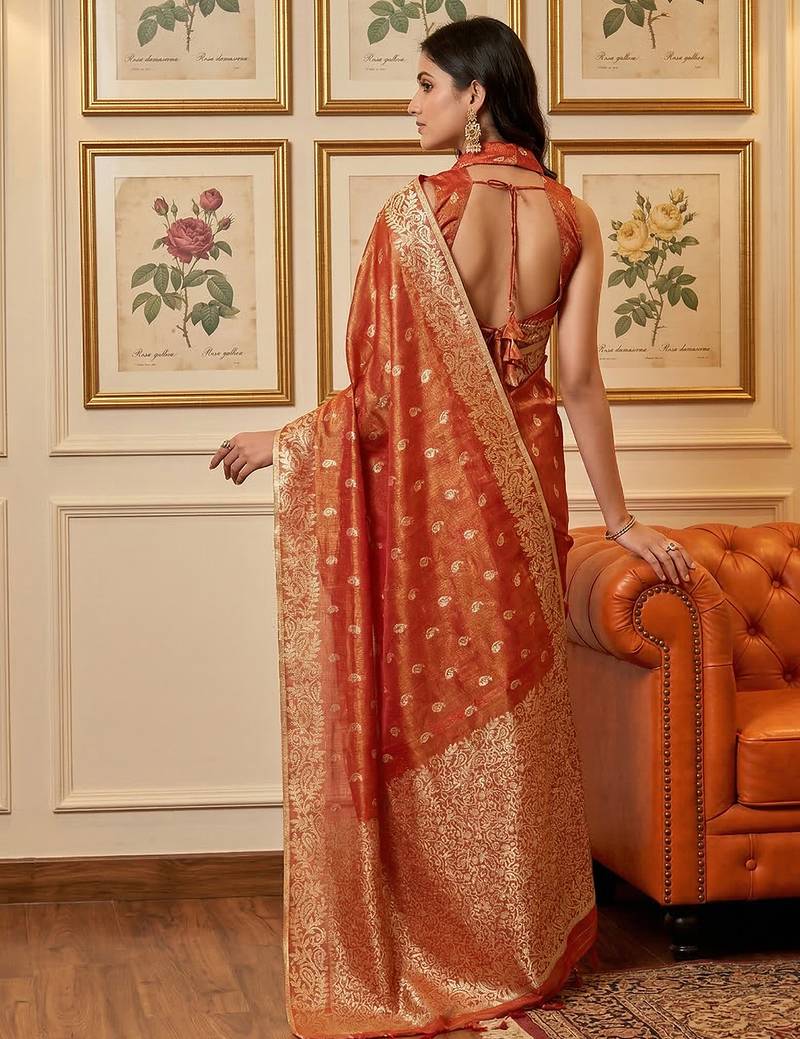 Sutriti red tissue silk saree for women wedding festive party ethnic wear
