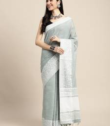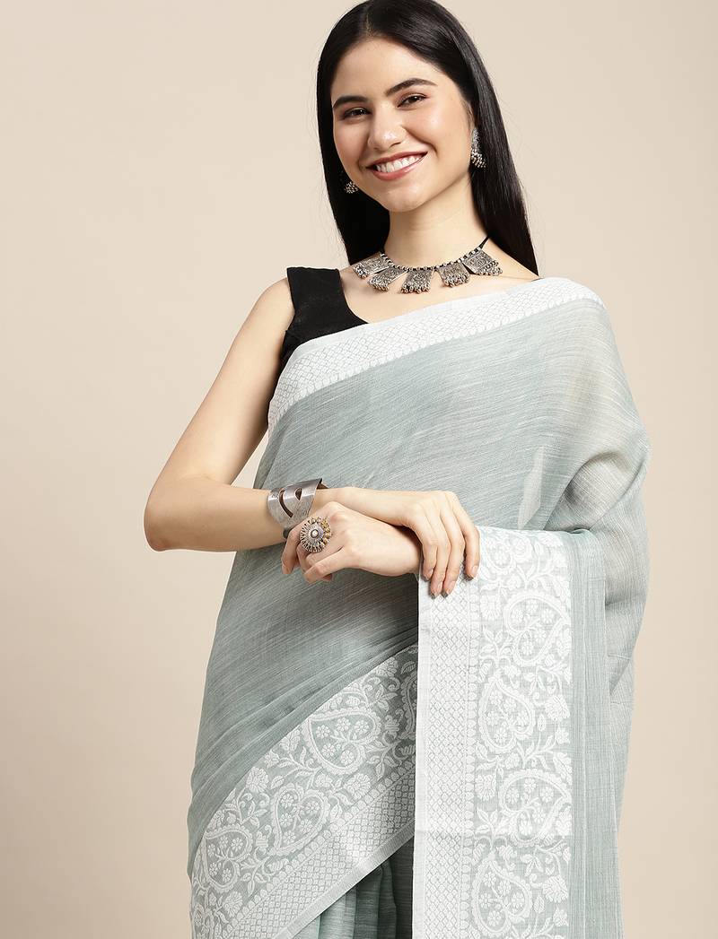Sutriti women teal green & silver-toned woven design linen blend saree