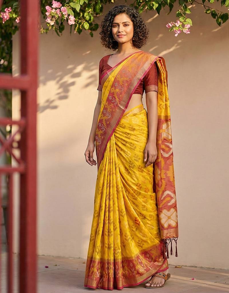 | Product Name | Sutriti Yellow & Maroon Pochampalli Soft Silk Saree With Traditional Ikat Pallu Sari | |