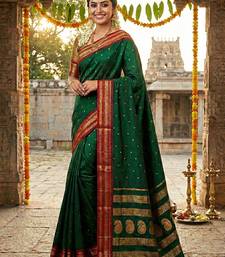 | Product Description | Exude A Sense Of Royal Calm And Classical Beauty With This Emerald Empress Soft Silk Saree. The Deep, Forest Green Body Symbolizes Nature And Prosperity, Enriched By Delicate Gold Zari Buttas. This Verdant Base Is Dramatically Framed By A Rich Crimson Red Border, A Classic Color Pairing In Indian Tradition. The Border And Grand Pallu Are Heavily Embellished With Ornate Gold Zari Work, Featuring Prominent Paisley And Temple Motifs |