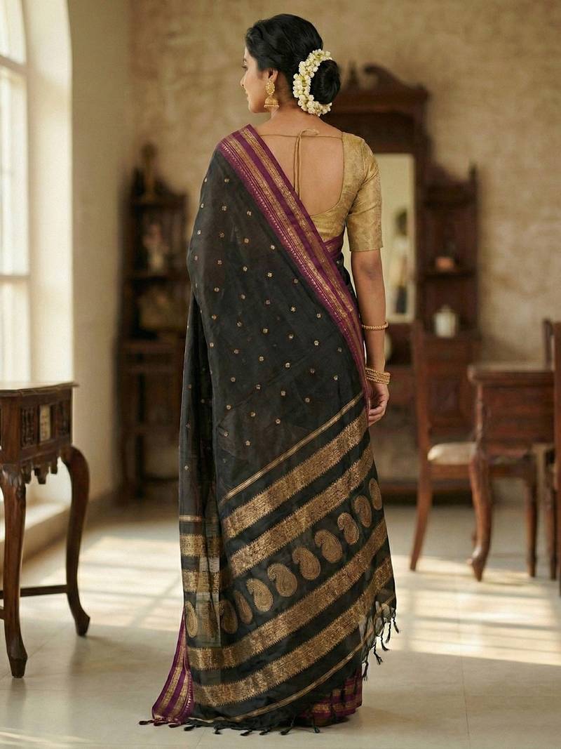 Embrace The Allure Of The Night With This Stunning Midnight Black Soft Silk Saree, A Masterpiece Of Understated Elegance And Traditional Charm. The Deep, Rich Black Body Serves As The Perfect Canvas For Delicate Gold Zari Buttas That Glimmer Like Distant Stars. The True Showstopper Is The Contrasting Vibrant Magenta Border, Intricately Woven With Heavy Gold Zari In Classic Temple And Geometric Patterns. The Pallu Culminates In A Grand Display Of Large, Traditional Paisley (Mango) Motifs