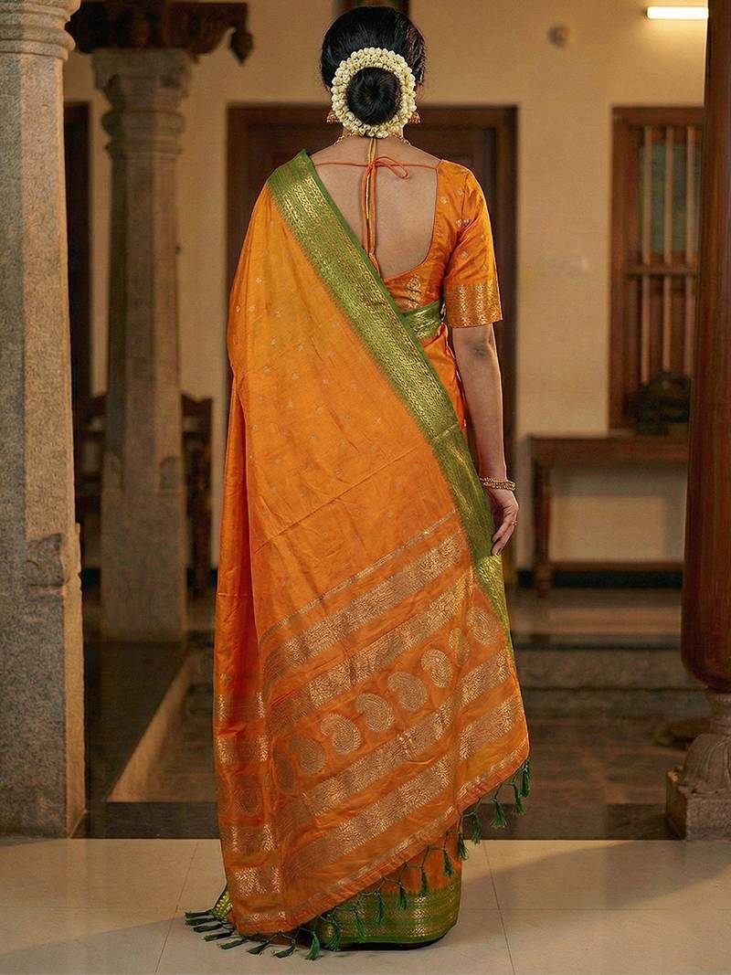 | Product Description | Radiate Joy And Energy With This Sunset Glow Orange Soft Silk Saree, Designed For The Woman Who Loves To Stand Out. The Vibrant Orange Body Is Like Captured Sunshine, Scattered With Sparkling Gold Zari Buttas That Catch The Light Beautifully. This Lively Base Is Contrasted Perfectly By A Striking Leaf Green Border And Pallu, Heavily Woven With Intricate Gold Zari Patterns And Large Paisley Motifs. The Combination Is Fresh, Trendy, And Inherently Festive. Crafted From Soft, Breathable Silk |
