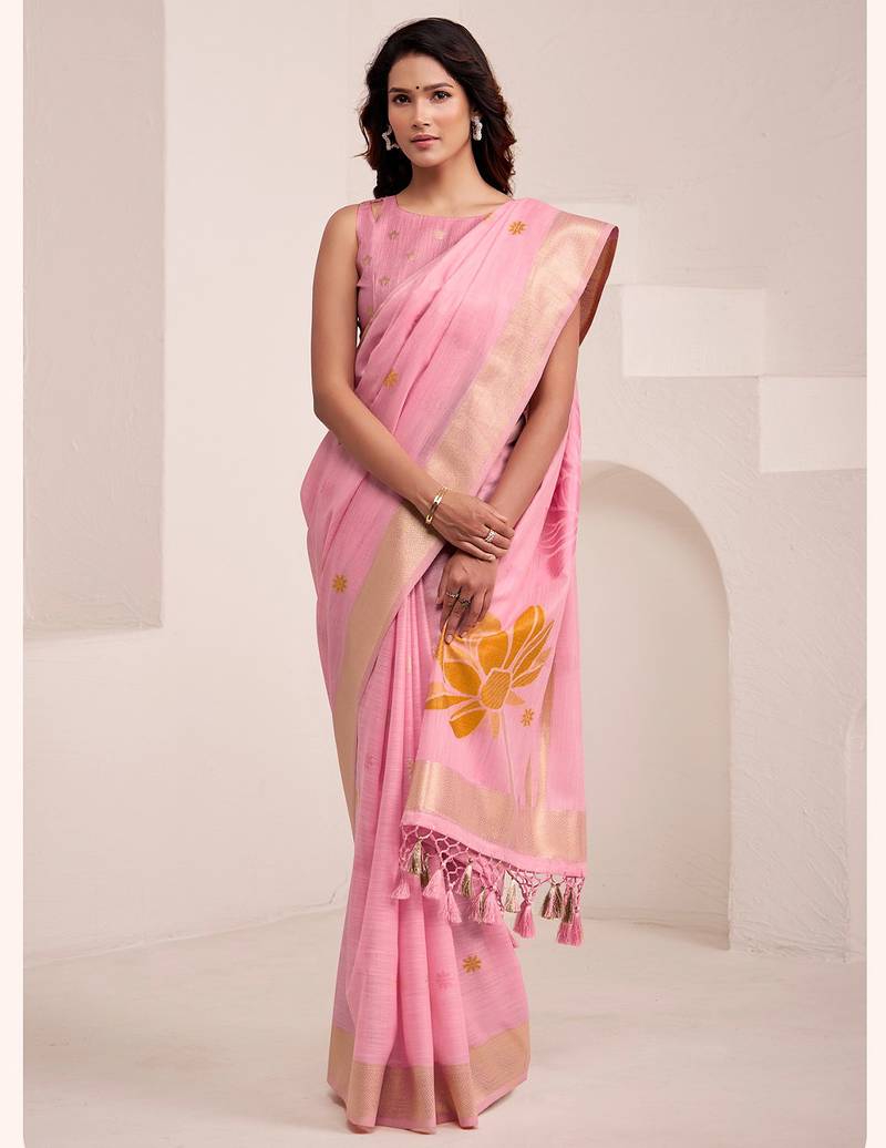 | Product Description | "Step Into Effortless Elegance With The Sutriti Floral Woven Linen Saree. This Collection Celebrates The Beauty Of Nature With Oversized Lotus Motifs Intricately Woven Into A Premium Linen Blend Fabric. The Saree Features A Shimmering Zari Border That Adds A Festive Touch, While The Lightweight Texture Ensures Maximum Comfort. Finished With Hand Tied Tassels, This Saree Is A Versatile Choice For The Modern Indian Woman Who Loves Pastel Hues And Traditional Craftsmanship." |