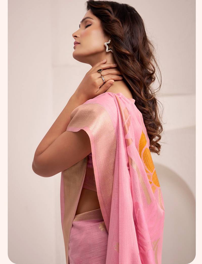 | Product Name | Women Baby Pink & Orange Floral Printed Linen Silk Blend Saree | |