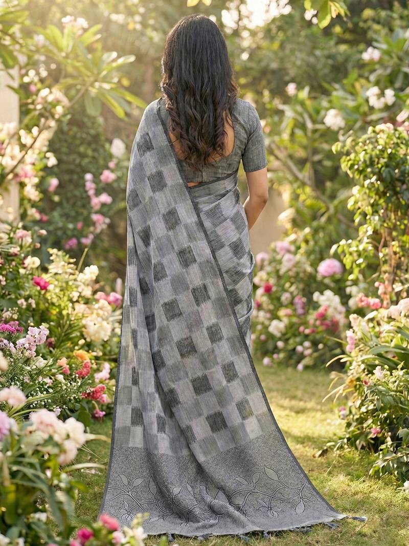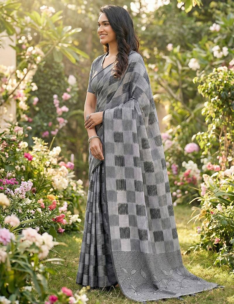 | Product Name | Women Grey & Black Checkered Linen Blend Saree With Floral Pallu | |