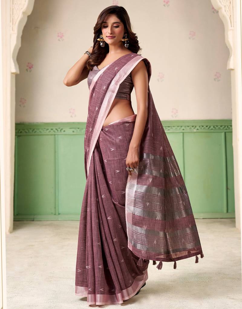 | Product Name | Women Mauve Purple Woven Design Linen Saree With Silver Zari | |