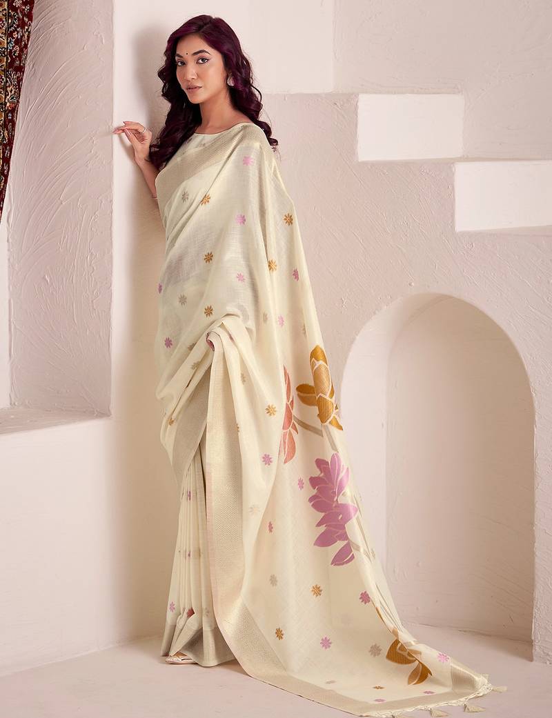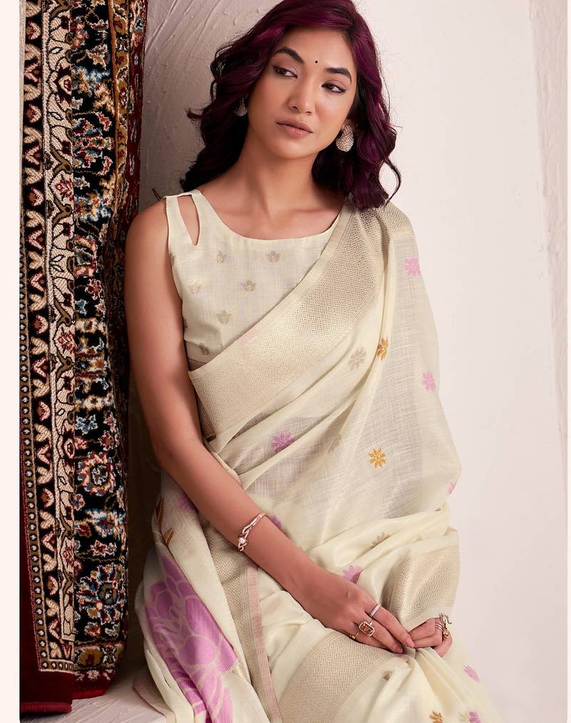 | Product Name | Women Off White & Pink Floral Printed Linen Silk Blend Saree | |