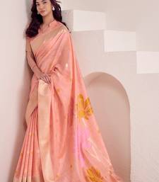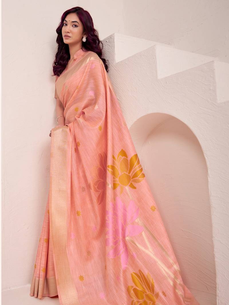 Women peach & yellow floral printed linen silk blend saree