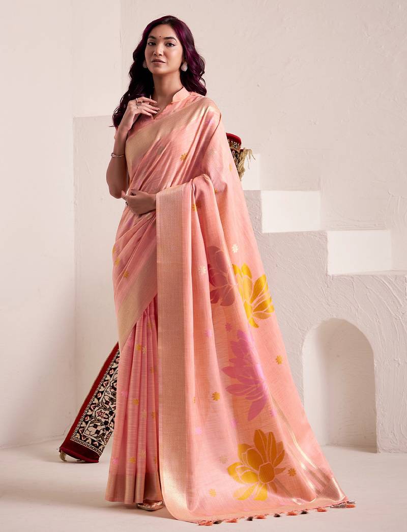 | Product Name | Women Peach & Yellow Floral Printed Linen Silk Blend Saree | |