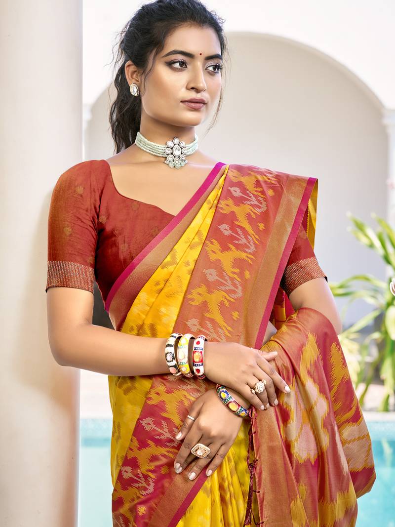 Yellow & orange pochampalli soft silk blend saree with traditional ikat pallu sari