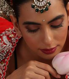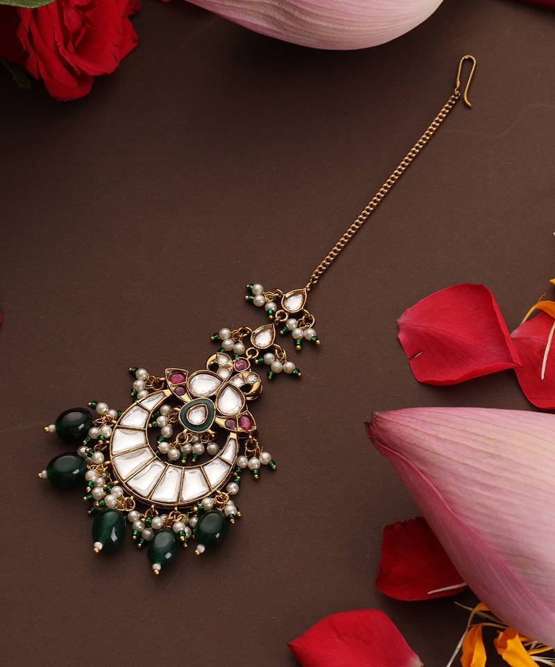 This Gold Plated Kundan Mang Tikka Is Adorned With Vibrant Green Stones, Exuding Traditional Elegance And Timeless Charm. Crafted With Intricate Detailing, It Beautifully Enhances Bridal And Festive Looks. Perfect For Weddings And Special Occasions, It Adds A Graceful, Statement Touch To Ethnic Ensembles.