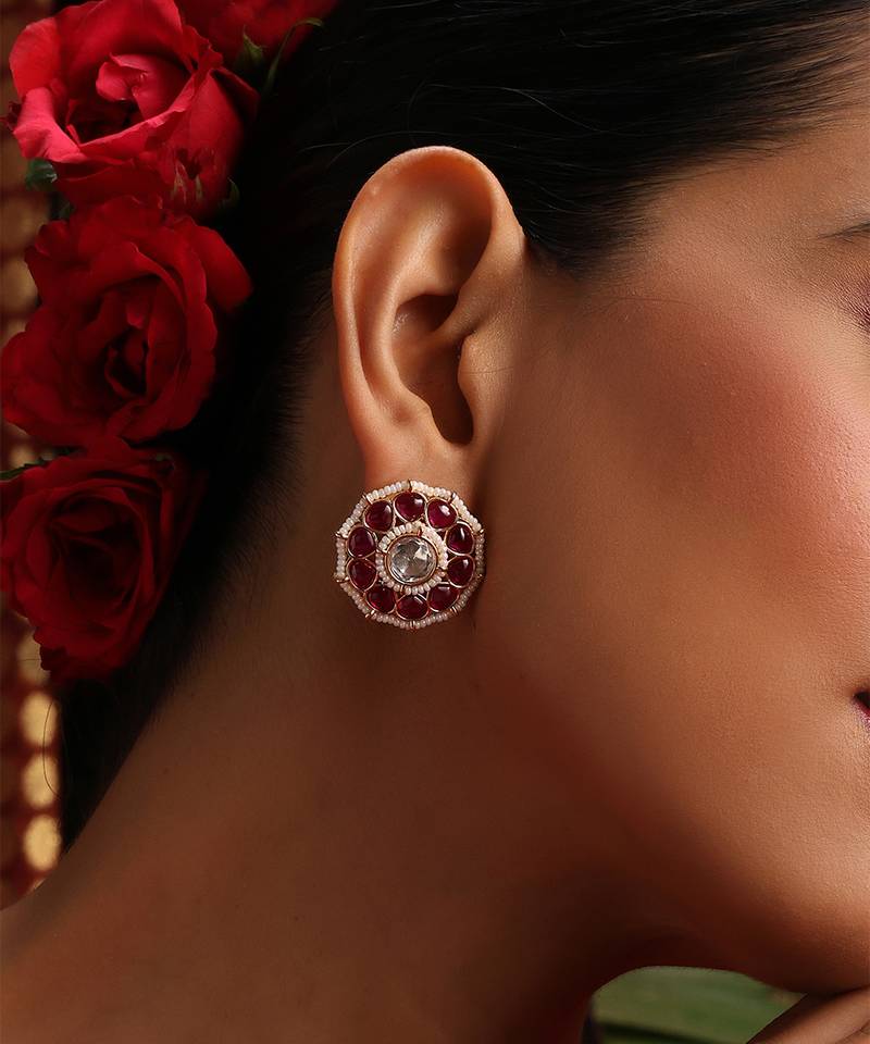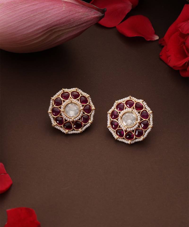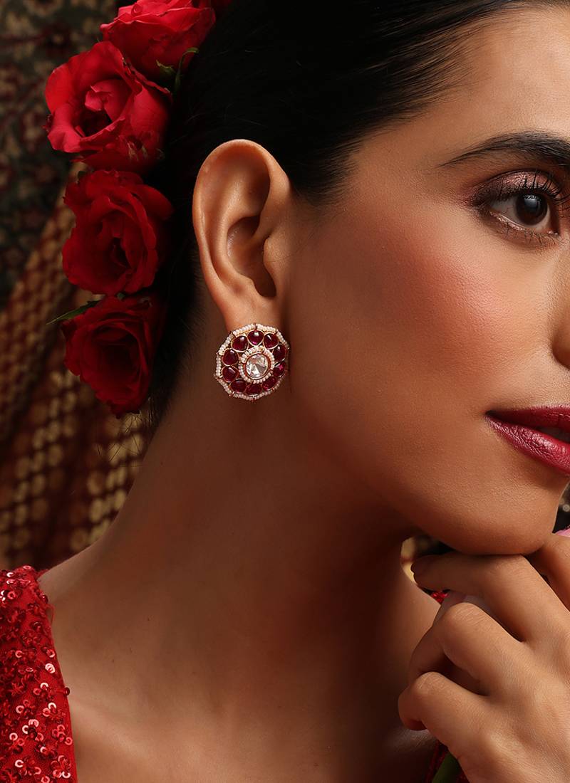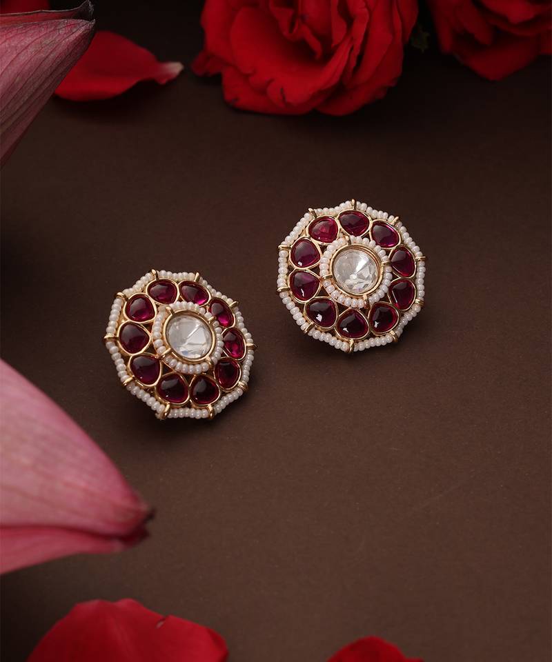 | Product Description | These Gold Plated Kundan Stud Earrings Are Adorned With Striking Red Stones, Radiating Timeless Elegance And Traditional Charm. Crafted With Intricate Detailing, They Add A Subtle Yet Graceful Touch To Festive And Bridal Looks. Perfect For Weddings And Special Occasions, They Enhance Ethnic Ensembles With Refined Sophistication.