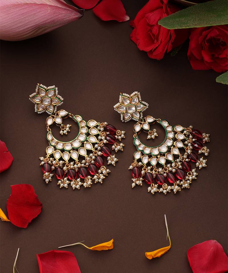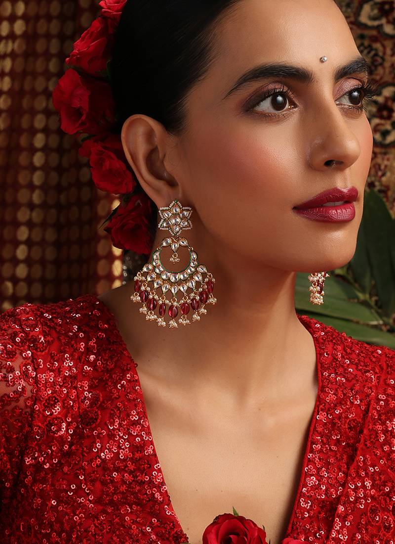 | Product Description | This Gold Plated Kundan Chandbali Earrings Are Adorned With Rich Red Stones, Exuding Traditional Elegance And Regal Charm. Crafted With Intricate Detailing, They Beautifully Frame The Face. Perfect For Weddings And Festive Occasions, They Add A Graceful Statement To Ethnic Ensembles With Timeless Sophistication.