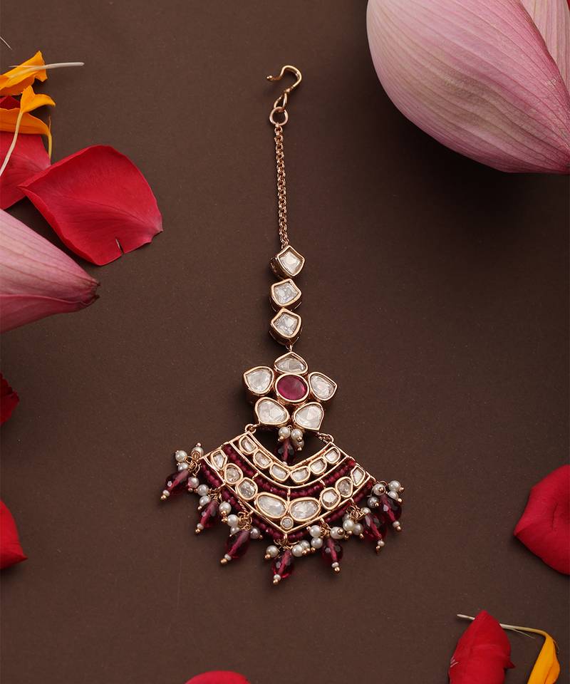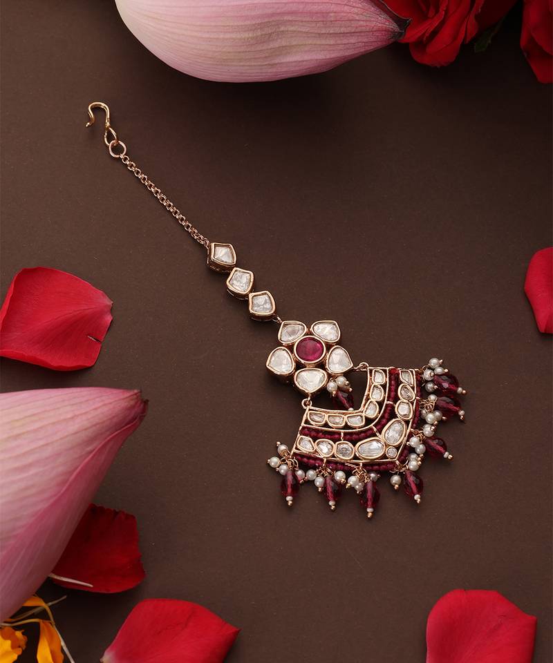 | Product Description | This Rose Gold Plated Kundan Mang Tikka Is Adorned With A Striking Red Stone, Exuding Timeless Elegance And Festive Charm. Featuring Intricate Craftsmanship, It Beautifully Enhances Bridal And Traditional Looks. Perfect For Weddings And Special Occasions, It Adds A Graceful, Statement Touch To Ethnic Ensembles.
