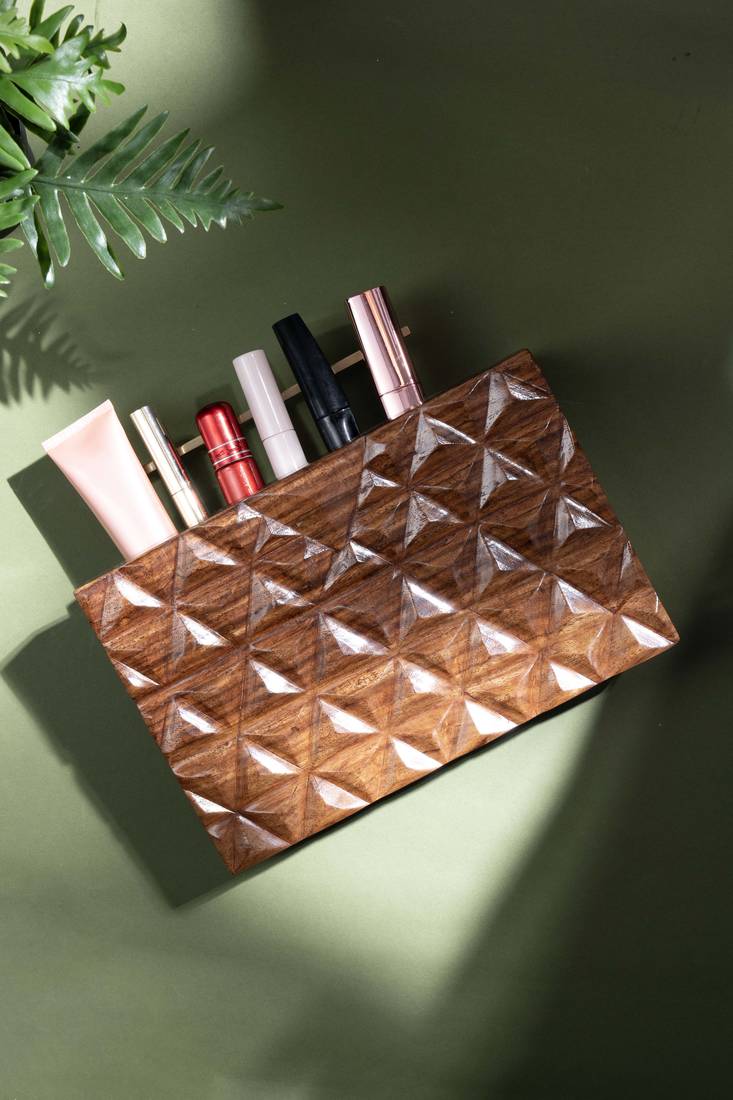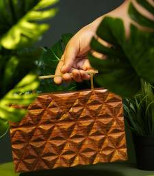 Product Description | Large Size Bag In Solid Sheesham Wood, To Carry All Your Utility.Hand Carved Geometric Pattern Of Concentric Triangles Add To The Drama |