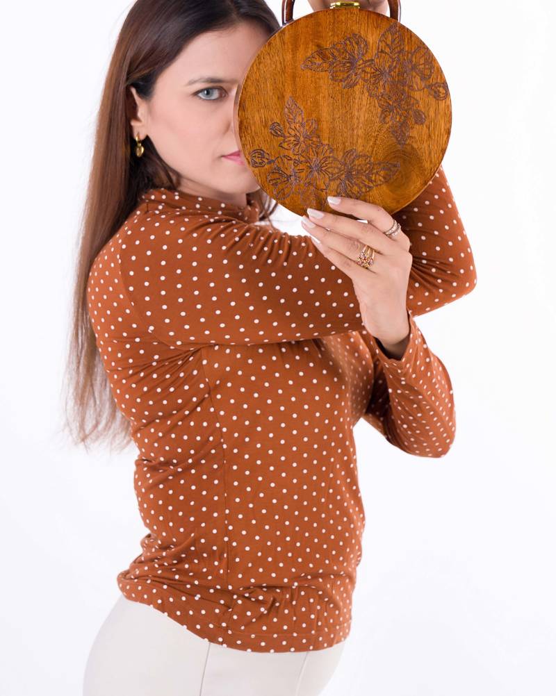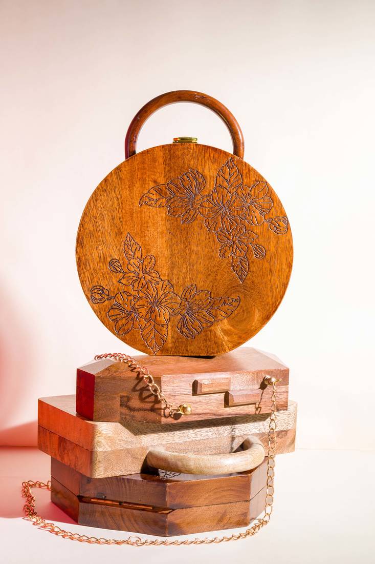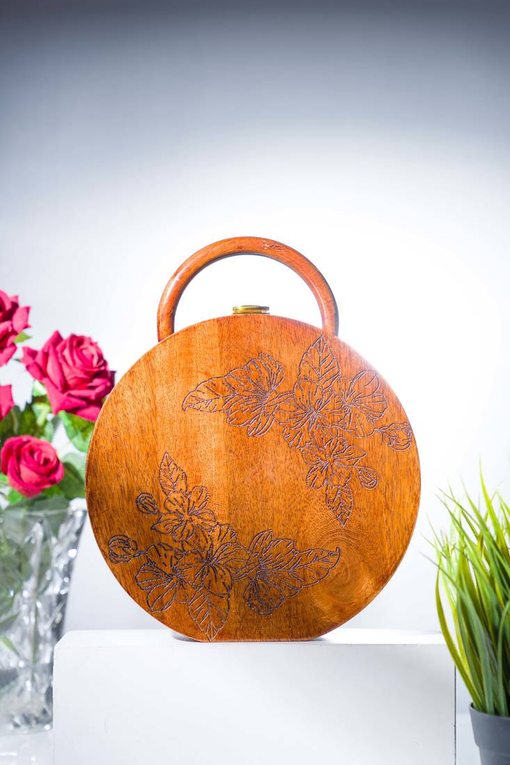 Product Description | Expertly Crafted From Solid Sheesham Wood With Delicate Floral Motifs And Skillfully Engraved On The Surface, This Round Shaped Wooden Bag Is Perfect For Any Occasion. The Magnetic Closure, Brass Sling Chain, And Printed Crape Inner Lining Add Functionality And Style To This Essential Accessory. |