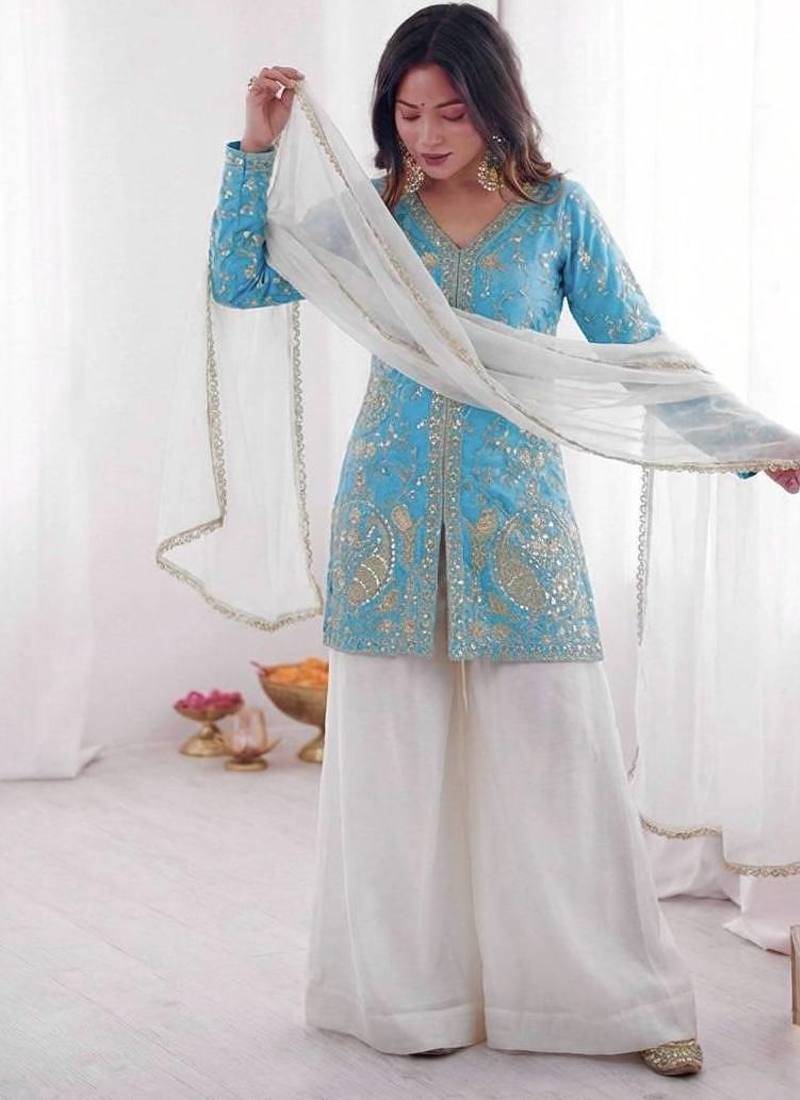 | Product Name | Blue And White Color Fendy Silk Embroidery Work Wedding Wear Salwar Suit | |