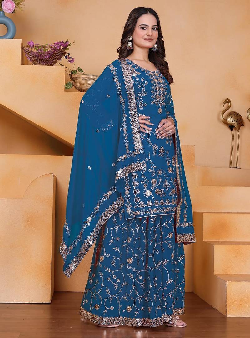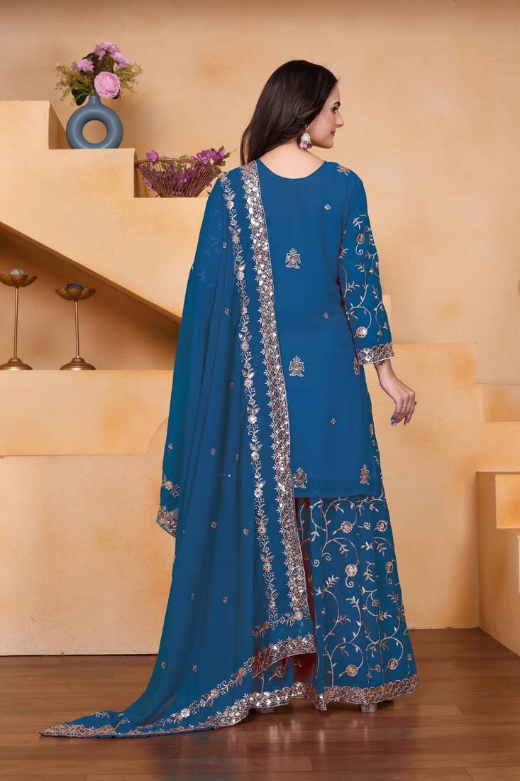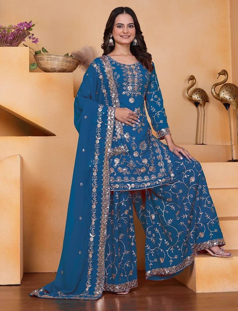 | Product Name | Blue Color Faux Georgette Embroidery Work Wedding Wear Plazo Set | |