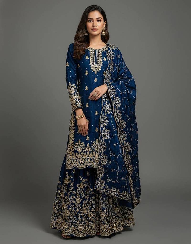 Blue color pure jimi silk embroidery work wedding wear plazo set stitched