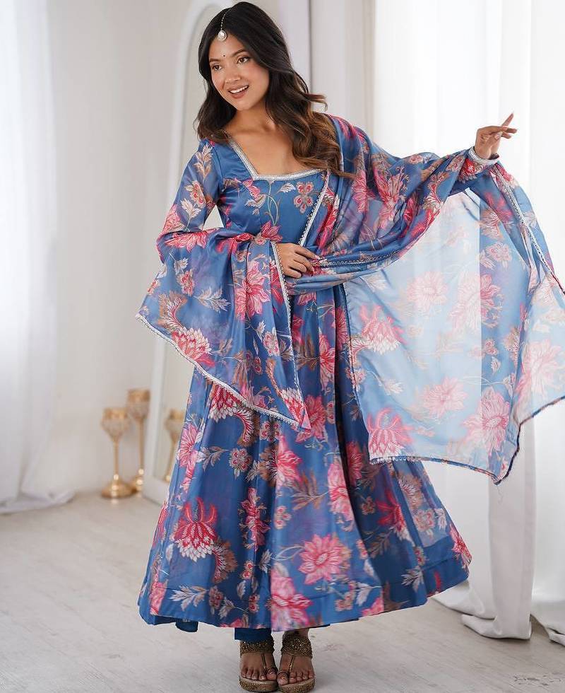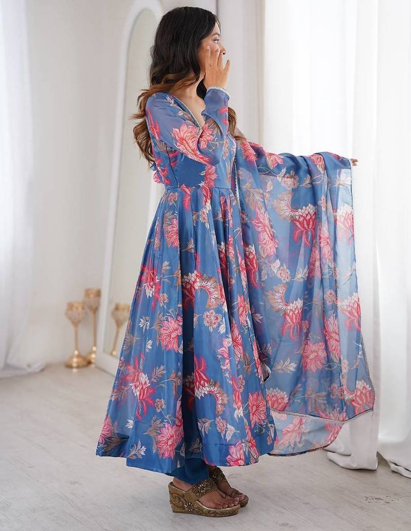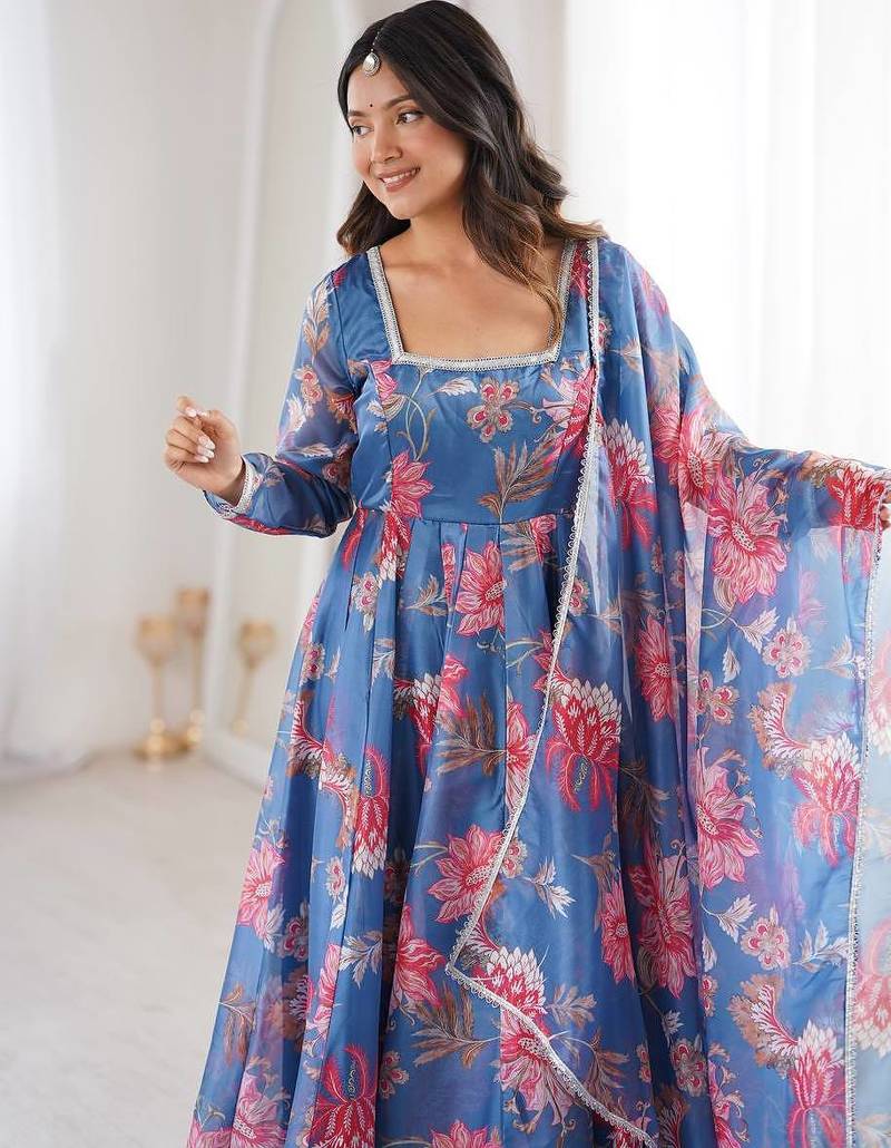 | Product Name | Blue Color Soft Organza Digital Print Party Wear Long Gown | |