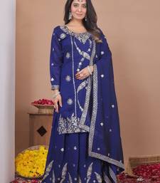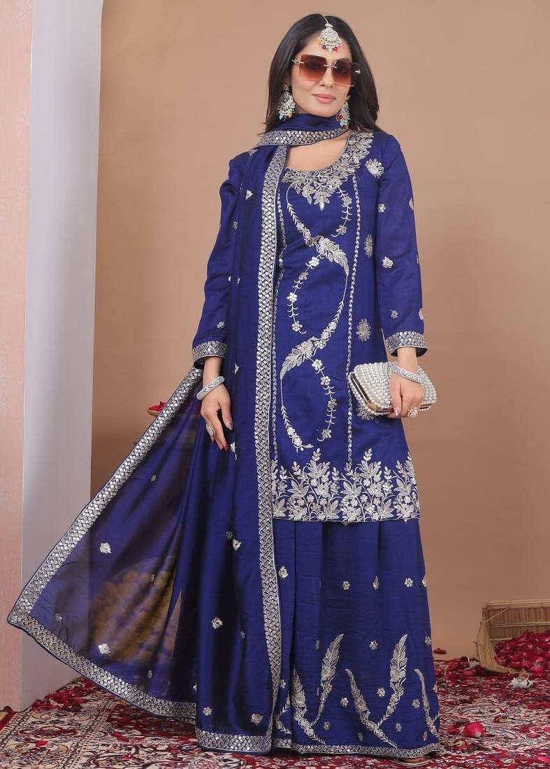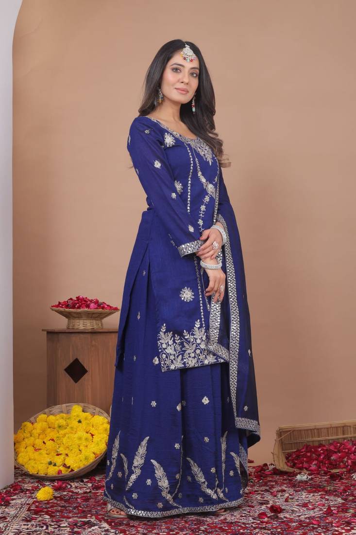 Blue color vichitra silk embroidery work wedding wear plazo set stitched