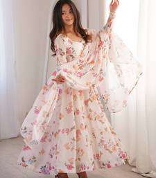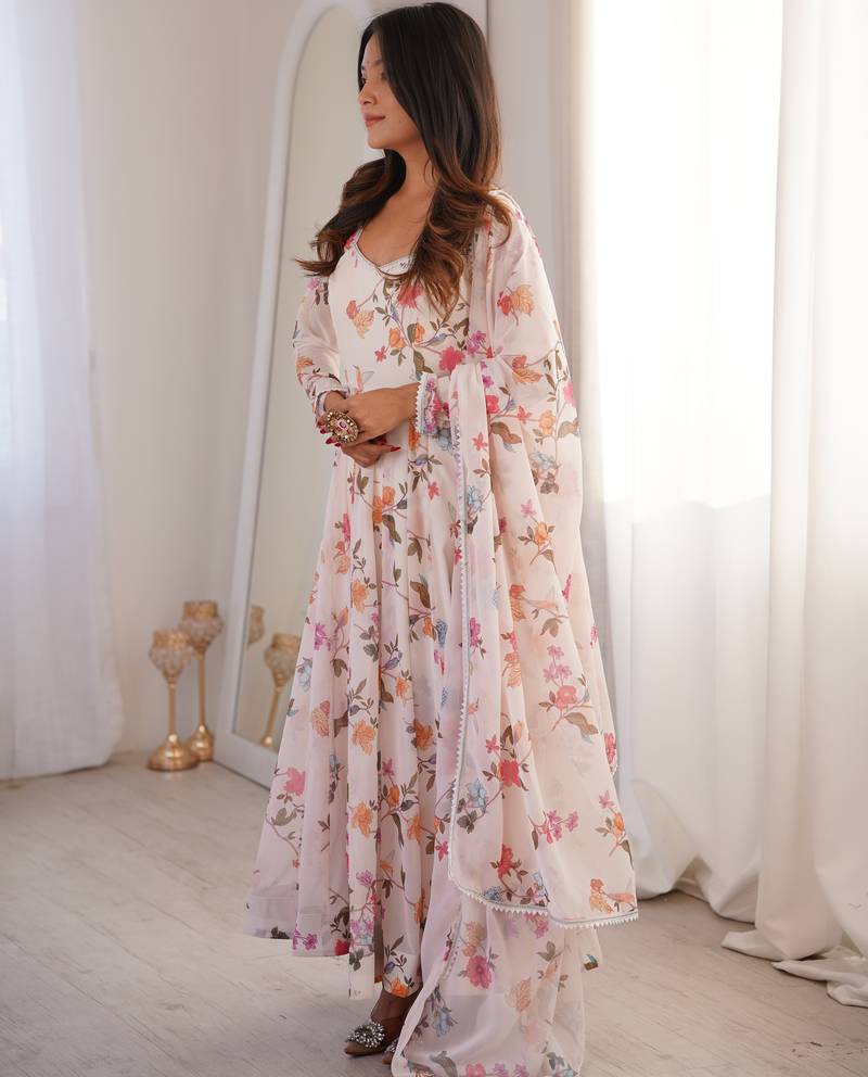 Cream color soft organza silk digital printed party wear gown stitched