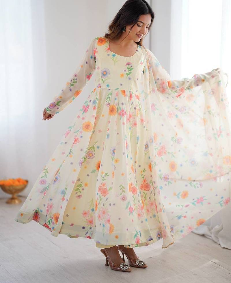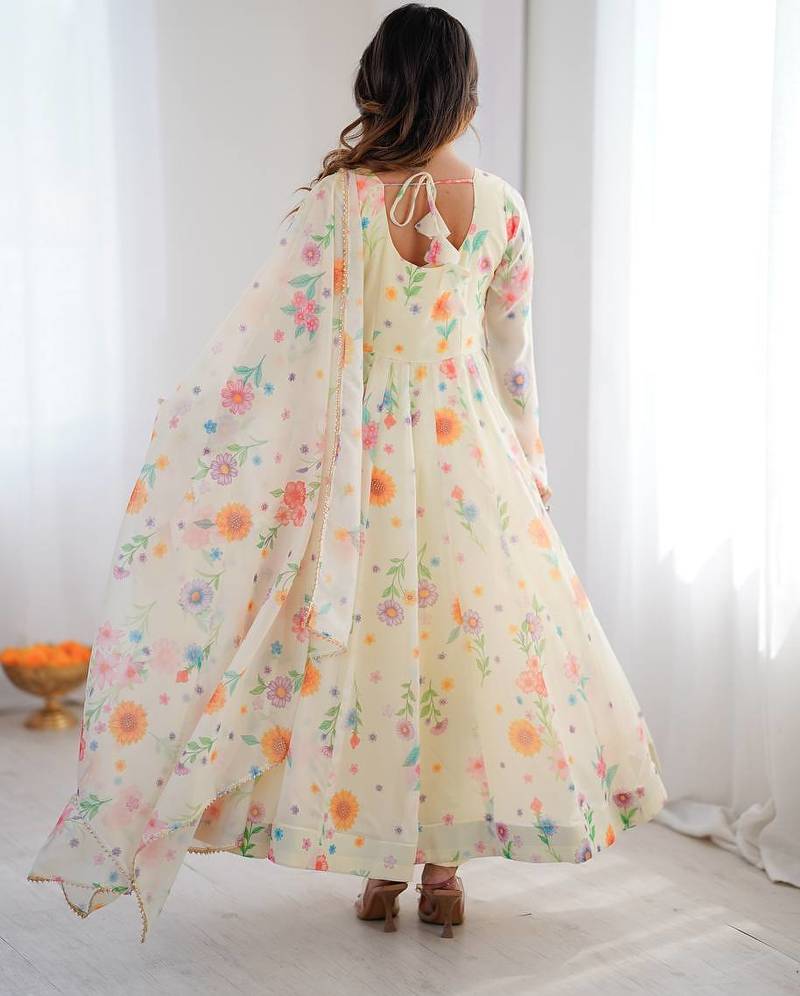 Cream color soft organza silk digital printed party wear gown stitched